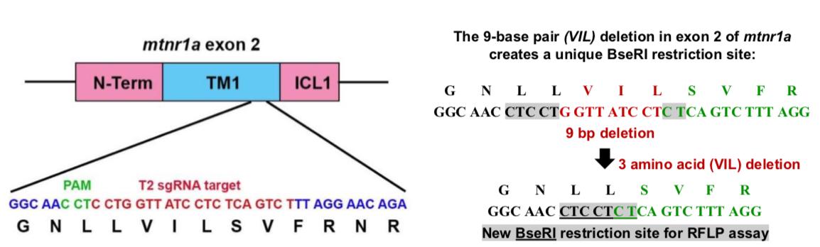 Figure S8. A novel restriction fragment length polymorphism (RFLP) assay uniquely identifies VIL mutants. Left panel: Schematic representation of exon 2 of the mtnr1a gene, with the TM-1 domain flanked by the amino-terminus (N-Term) and first intracellular loop (ICL-1) domains. The nucleotide sequence targeted by the T2 sgRNA at the lower area of the panel is indicated in red, with the concomitant amino acid sequence below. The protospacer-adjacent motif (PAM) sequence, which directs Cas9 targeting, is indicated in green. Some flanking nucleotide sequence is indicated in blue. Right panel: The VIL deletion merges the upstream CTCCT sequence with the downstream CT sequence to create a unique BseRI restriction site. |
