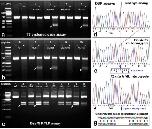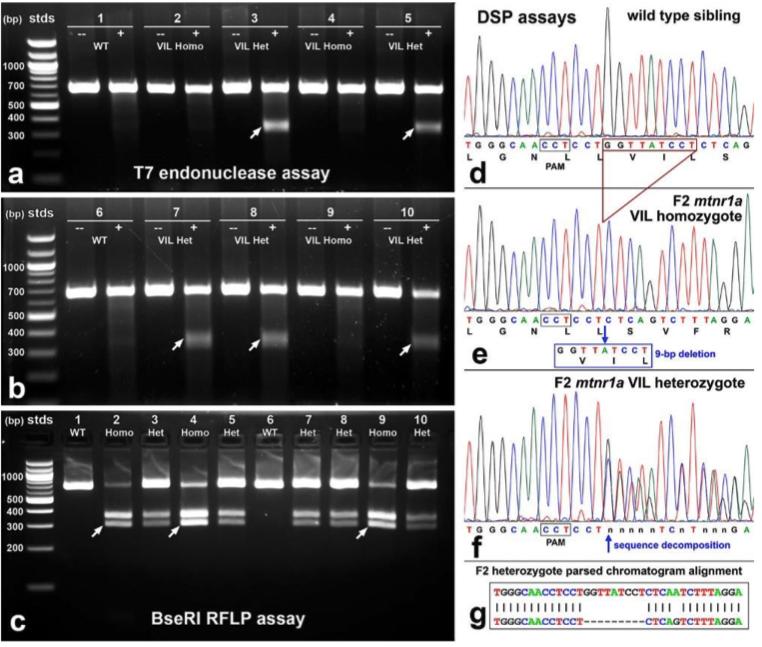 Figure 2. Identification of heterozygous F1 animals with CRISPR/Cas9 indel mutations of the mtnr1a gene. (a) Representative RFLP analysis shows that PCR products of mtnr1a VIL heterozygotes display two predicted cleavage bands (arrows), whereas WT and non-VIL mutant DNA is not cleaved. The creation of a BseRI site by the VIL deletion is illustrated in Supplementary Fig. S3. (b) Direct PCR Sanger sequencing chromatogram of F1 WT progeny display prominent peaks for all bases in the T2 sgRNA target area. The T2 PAM sequence (CCT) is boxed in black, and the downstream 9-bp sequence of the mtnr1a VIL deletion mutation is boxed in blue. The corresponding amino acid sequence is shown below the nucleotide codon sequence. (c) In an F1 tadpole heterozygous for the mtnr1a 9-bp (VIL) deletion, the trace decomposes (i.e., mixed base calls) at the predicted target site 4-bp downstream of the T2 PAM site, and continues to the end of the trace, as expected for a heterozygous indel mutation. The decomposed sequence represents the overlapping peaks of the mtnr1a WT and VIL alleles. (d) Partial view of alignments from Poly Peak Parser (https://yosttools.genetics.utah.edu/PolyPeakParser/) output revealing the heterozygous 9-bp mtnr1a VIL deletion mutation. The WT allele is the top line and the mutant allele is the bottom line. |