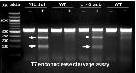Figure S2. Cas9 in vitro cleavage assay with sgRNAs. Genomic DNA from a Nigerian strain wild type (WT) X. tropicalis adult was used as the PCR template. DNA PCR products were incubated with sgRNA and Cas9 protein, and then separated on an agarose gel. PCR products of WT gDNA were cleaved into the predicted sizes of DNA fragments (white arrows) when incubated in vitro with Cas9 protein (T1, T2, and T3 lanes). The T1 and T2 target sites are in close proximity to each other on exon 2, so the Cas9 cleavage could be detected using the same PCR primer pairs (T12). The T3 target site was in exon 3, so a different set of PCR primers was used to amplify that region. PCR products that were not incubated with the Cas9 enzyme (--) displayed no cleavage bands. |