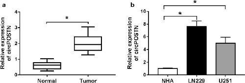 Fig. 1. The expression level of circPOSTN in glioma tissues and cells. a, b The relative expression level of circPOSTN was determined with RT-qPCR assay in glioma tissues and normal tissues, as well as in NHA, LN229 and U251 cells (with GAPDH as housekeeping gene). *P < 0.05 |