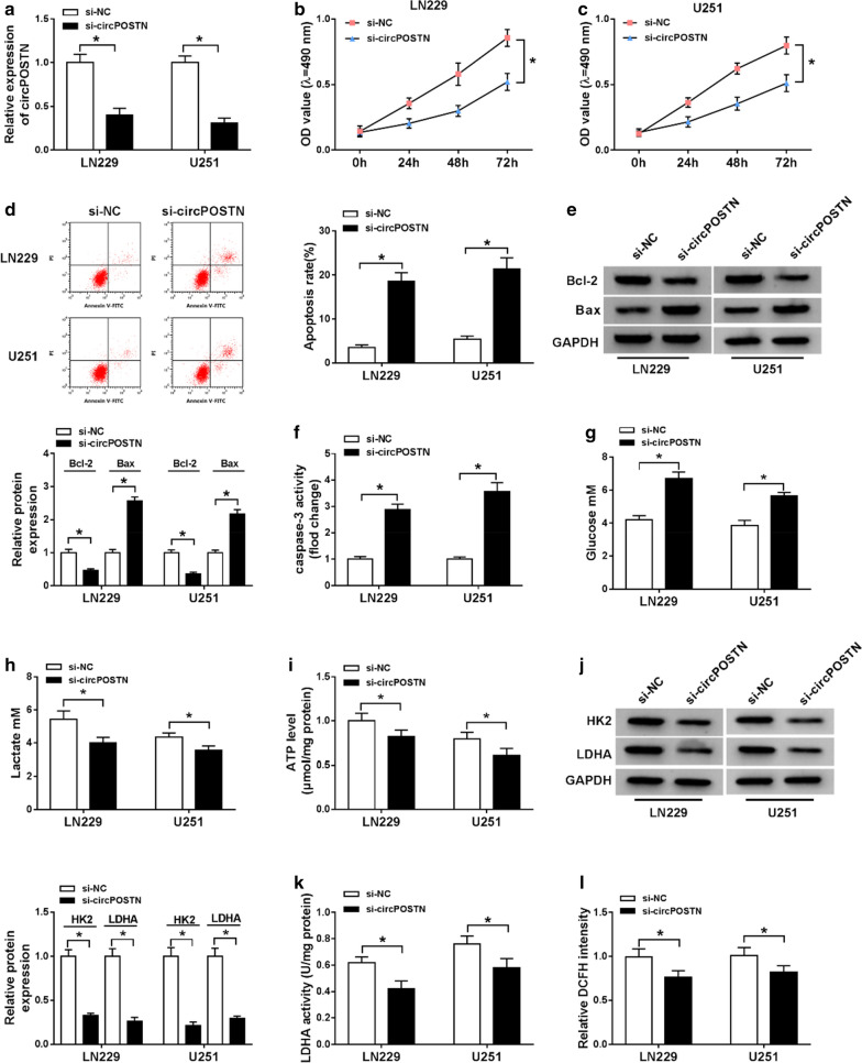 Fig. 2. The influences of circPOSTN silencing on proliferation, apoptosis and aerobic glycolysis of glioma cells. aâl LN229 and U251 cells were transfected with si-circPOSTN or si-NC. a The interference efficiency of si-circPOSTN was analyzed with RT-qPCR assay in LN229 and U251 cells. b, c Effect of circPOSTN silencing on the cell viability of LN229 and U251 cells was assessed with MTT assay. d The apoptosis rate was computed with flow cytometry assay in transfected LN229 and U251 cells. e The western blot assay showed the expression levels of Bcl-2 and Bax in LN229 and U251 cells. f The caspase-3 activity was measured with a caspase-3 assay kit. gâi The concentration of glucose and lactate in the culture medium, as well as ATP production level were measured with a series of kits, respectively. j The protein expression levels of HK2 and LDHA were determined with western blot assay in transfected LN229 and U251 cells. kâl LDHA enzyme activity and ROS accumulation were evaluated in LN229 and U251 cells post-transfection with lactate dehydrogenase activity detection kit and reactive oxygen species assay kit, respectively. *Pâ<â0.05 |