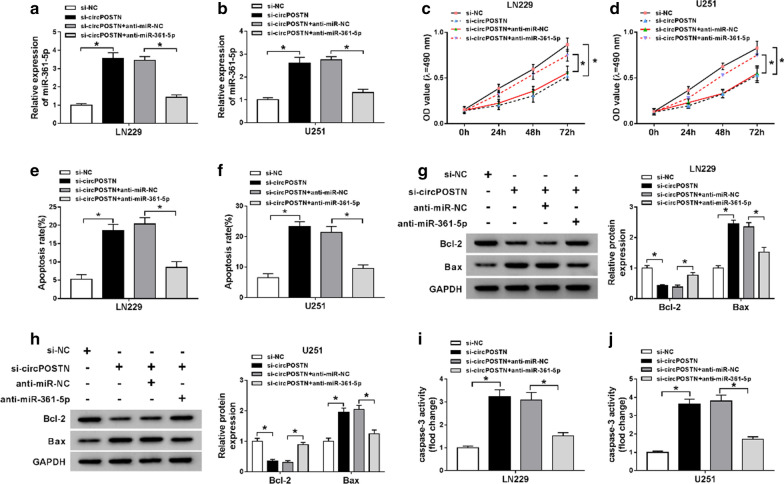 Fig. 4. Knockdown of circPOSTN mediated-effects on proliferation and apoptosis of glioma cells could be eliminated by silencing miR-361-5p. aâj LN229 and U251 cells were transfected with si-NC, si-circPOSTN, si-circPOSTNâ+âanti-miR-NC, or si-circPOSTNâ+âanti-miR-361-5p. a, b The relativity expression level of miR-361-5p was analyzed with RT-qPCR assay in LN229 and U251 cells. c, d MTT assay was administrated to assess cell viability of LN229 and U251 cells after transfection. e, f The apoptosis of transfected LN229 and U251 cells was monitored by flow cytometry. g, h The western blot assay was employed to show the expression levels of Bcl-2 and Bax in LN229 and U251 cells. i, j The caspase-3 activity was examined by caspase-3 assay kit. *Pâ<â0.05 |