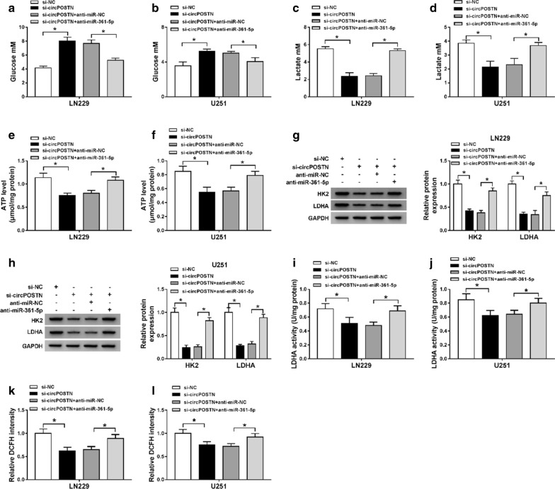 Fig. 5. CircPOSTN silencing inhibited aerobic glycolysis of glioma cells via regulating miR-361-5p. aâl LN229 and U251 cells were transfected with si-NC, si-circPOSTN, si-circPOSTNâ+âanti-miR-NC, or si-circPOSTNâ+âanti-miR-361-5p. aâf The concentration of glucose and lactate, as well as cellular ATP level were detected with different kits. g, h The protein expression levels of HK2 and LDHA in LN229 and U251 cells were measured with western blot assay. iâl The enzyme activity of LDHA and ROS level were measured in transfected LN229 and U251 cells. *Pâ<â0.05 |