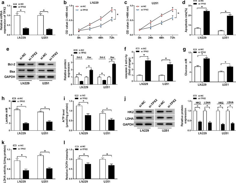 Fig. 7. TPX2 regulated proliferation, apoptosis, and aerobic glycolysis in glioma cells. aâl LN229 and U251 cells were introduced with si-NC or si-TPX2. a The transfection efficiency of si-TPX2 was checked with RT-qPCR assay in LN229 and U251 cells. b, c The cell viability of LN229 and U251 cells was determined with MTT assay. d The apoptosis rate of transfected LN229 and U251 cells was represented by flow cytometry assay. e The western blot assay was used to assay the expression levels of Bcl-2 and Bax in LN229 and U251 cells. f The activity of caspase-3 was detected with a caspase-3 assay kit. gâi The glucose, lactate, and ATP production levels were shown. j The protein expression levels of HK2 and LDHA were estimated by western blot assay in LN229 and U251 cells. k, l LDHA enzyme activity and ROS content were evaluated in LN229 and U251 cells post-transfection. *Pâ<â0.05 |