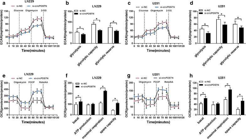 Fig. 8. Extracellular acidification rate and oxygen consumption rate assays in glioma cells. a–d The extracellular acidification rate curve was presented by Seahorse XF assay in LN229 and U251 cells transfected with si-circPOSTN or si-NC. e–h The quantification of oxygen consumption rate was measured with Seahorse XF assay in LN229 and U251 cells with circPOSTN knockdown. *P < 0.05 |