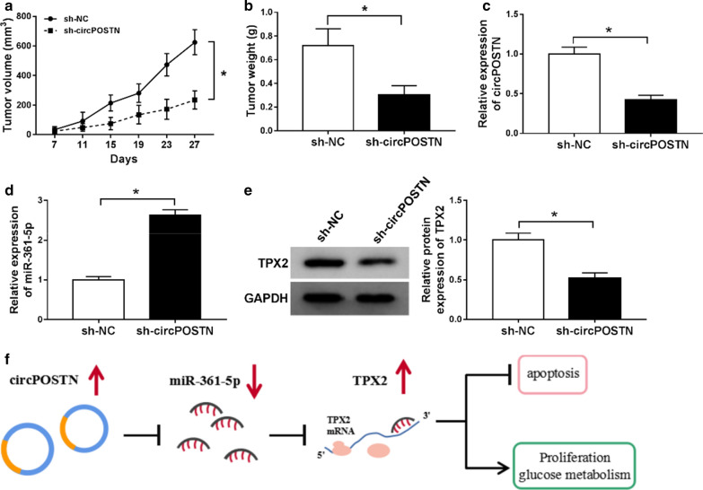Fig. 9. Silencing of circPOSTN repressed glioma tumor growth in vivo. a, b Tumor volume and weight were presented. c, d The expression levels of circPOSTN and miR-361-5p in dissected tumor tissues were estimated with RT-qPCR assay. e Western blot assay was executed to test protein level of TPX2 in dissected tumor tissues. f The diagrammatic representation of our conclusion was shown. *Pâ<â0.05 |