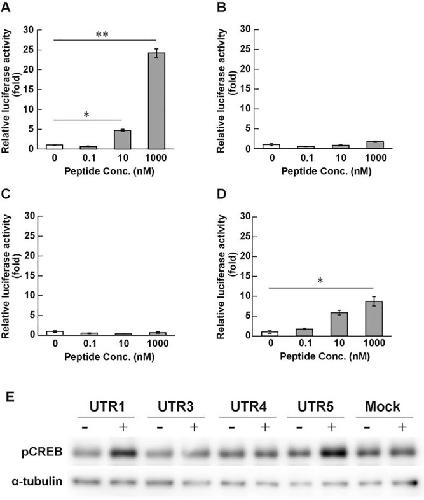 Fig. 6. Urotensin II (UII)-stimulated luciferase activities in HEK293T cells transfected with single urotensin II receptor (UTR) subtypes and CRE-luciferase reporter vector. Cells were stimulated with UII of the indicated doses of UII for 2 h. UII-stimulated luciferase activities in the cells expressing UTR1 (A) or UTR5 (D) were significantly increased compared with those of unstimulated cells expressing UTR1 or UTR5. Cells expressing UTR3 (B) or UTR4 (C) showed no response to UII stimulation. Values are expressed as fold increase vs. unstimulated cells (control) and are presented as the mean ± SEM of three independent experiments. **p < 0.01, *p < 0.05 vs. control (one-way analysis of variance using Dunnett’s test). (E) Cells transfected with single UTR subtypes were stimulated with UII (100 nM) for 30 min. Cell extracts were western blotted using antibodies for phosphorylated and total CREB protein. The indicated blot is representative of two independent experiments.