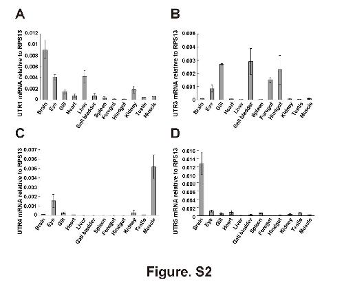 Fig. S2. Relative mRNA expression levels for urotensin II receptor (UTR) subtypes in various tissues of O. latipes. mRNA expression levels of single UTR subtypes are represented as ratios to the mRNA level of the housekeeping gene RPS13. Values are estimates for samples from three fish. A–D, relative mRNA expression level of single UTR subtypes in male and female fish.