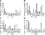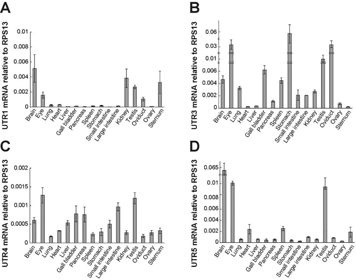 Fig. 3. Relative mRNA expression levels for urotensin II receptor (UTR) subtypes in various tissues of Xenopus tropicalis. mRNA expression levels of single UTR subtypes are represented as ratios to the mRNA level of the housekeeping gene RPS13. Values are estimates for samples from three frogs. A–D, relative mRNA expression level of UTR subtypes in male and female frogs.