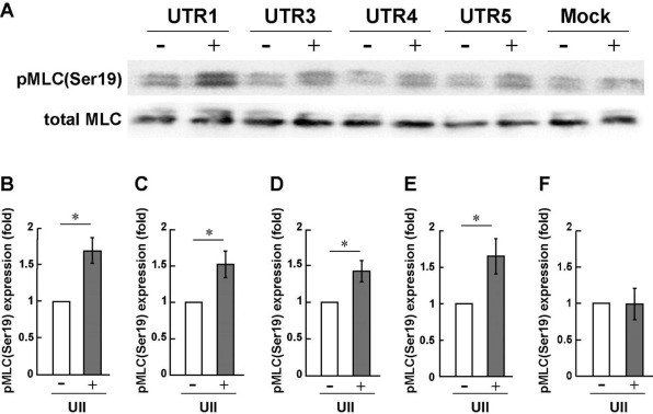 Fig. 9. Phosphorylation of myosin light chain (MLC) by urotensin II (UII) stimulation in the cells expressing single urotensin II receptor (UTR) subtypes. (A) Cells transfected with single UTR subtypes were stimulated with UII (100 nM) for 30 min. Cell extracts were western blotted using antibodies for phosphorylated and total MLC protein. The indicated blot is representative of three independent experiments. (B) Phosphorylation levels of MLC were normalized to total MLC levels. Values are expressed as fold increase vs. unstimulated cells (control) and are presented as the mean ± SEM of three independent experiments. *p < 0.05 vs. control (Welch’s test).