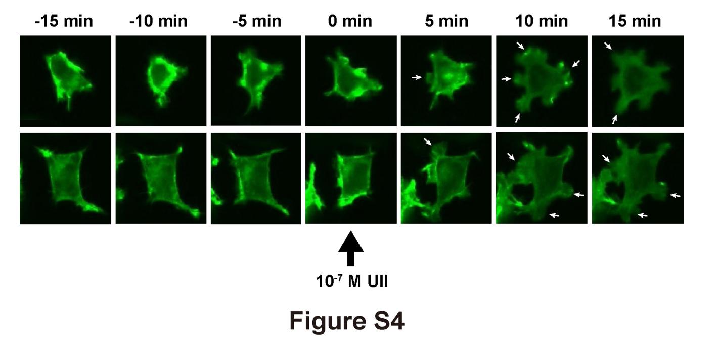 Fig. S4. Lamellipodia formation observed after urotensin II (UII) stimulation of urotensin II receptor 1 (UTR1) expressing cells. Living HEK293T cells co-transfected with Xenopus UTR1 and Lifeact-GFP (F-actin marker) were imaged in real-time using time-lapse videomicroscopy for 60 min, and individual frames were recorded before and during exposure to 100 nM UII. Lamellipodia formation (white arrow) was observed within 10 min after the addition of UII.