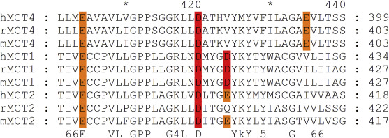 Fig. 2. Sequence alignment of MCT1, 2, and 4. Amino acid sequences of MCTs were aligned using the EMBL-EBI web server [21]. Glutamic acids are highlighted in orange, and aspartic acids are highlighted in red. (For interpretation of the references to colour in this figure legend, the reader is referred to the Web version of this article.)