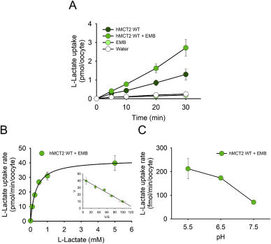 Fig. 3. Characterization of hMCT2-expressing oocyte. (A) Time course of l-lactate uptake via hMCT2 WT, hMCT2 WT + EMB, EMB, and Water were measured after incubation for the indicated time periods with standard buffer containing 1 μM l-lactate at pH 5.5. (B) The concentration dependence of l-lactate uptake via hMCT2 + EMB was assayed at the indicated concentrations for 10 min. Kinetic analysis was performed by fitting the Michaelis-Menten equation. Eadie-Hofstee plot of the date is exhibited in inset, where the l-lactate uptake rate (V) was plotted against V/[l-lactate] (V/S). (C) The pH dependence of hMCT2 + EMB was measured after 10 min of incubation with standard buffer at pH 5.5, 6.5, and 7.5 added in 1 μM l-lactate. All data are mean values ± S.E. from three independent experiments, each performed with three to five technical replicates.
