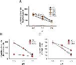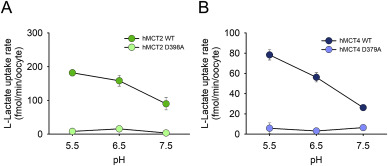 Fig. 4. pH dependence of hMCT2 and 4 aspartic acid mutants. (A, B) The effect of extracellular pH on hMCT2 and 4 mutants was assessed after 10 min of incubation with standard buffer at pH 5.5, 6.5, and 7.5 added in 1 μM l-lactate. All data are mean values ± S.E. from three independent experiments, each performed with three to five technical replicates.