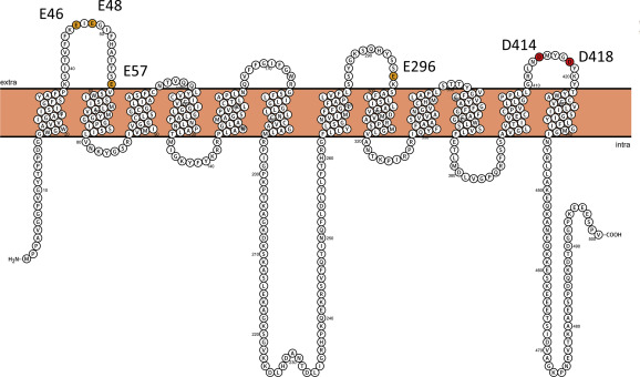 Fig. S1. 2-Dimensional topology model of hMCT1. 2-Dimensional topology model of hMCT1 with extracellular glutamic acids and aspartic acids highlighted in orange- and red-color, respectively, was visualized using the PROTTER web server. The transmembrane domains were predicted using the CCTOP web server.