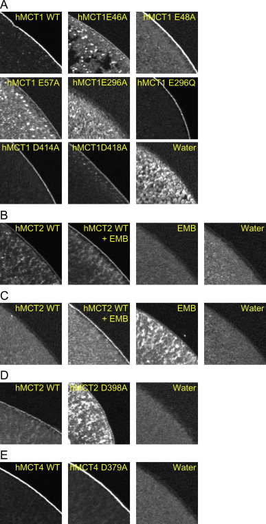 Fig. S2. Membrane localization of hMCT1, 2, and 4, and embigin in <span data-format=italic>Xenopus laevis </span>oocytes. The expression of the indicated cRNA in oocytes was examined by fluorescence microscopy using an anti-hMCT1 antibody (A), anti-hMCT2 antibody (B, D), anti-embigin antibody (C), anti-hMCT4 antibody (E).