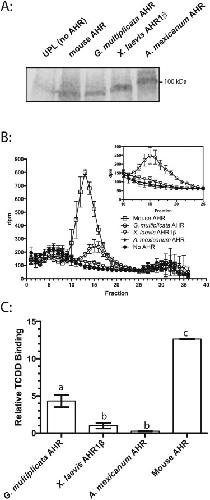 Fig. 2. TCDD binding by G. multiplicata AHR. (A) Expression of each AHR in TNT reactions determined by Western blotting. (B) Velocity sedimentation analysis of TCDD binding. Synthetic AHR proteins or unprogrammed TNT lysates were incubated with 2 nM [3H]TCDD and fractionated on sucrose density gradients. Inset graph excludes mouse AHR and contains re-scaled y-axis. (C) Quantification of TCDD-specific binding revealed by sedimentation analysis. The radioactivity (disintegrations per minute) in fractions comprising each peak in panel B was summed. Specific binding is the difference between total binding (preparations containing an AHR) and nonspecific binding (preparation lacking AHR). The bar graph plots specific binding relative to that found for X. laevis AHR1β. Values represent means ± the standard error of four replicates. Values with identical labels do not differ significantly (One-way ANOVA with Tukey’s test for individual contrasts).