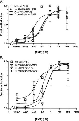 Fig. 4. FICZ-induced transactivation activity of G. multiplicata AHR. Fractional induction of reporter gene expression by each AHR following (A) 18-h or (B) 3-h exposure was determined as described for Fig. 3. Values represent mean ± standard error for at least four replicates. Panel A: r2 values for the fitted curves are 0.86 for G. multiplicata AHR, 0.91 for X. laevis AHR1β, 0.98 for A. mexicanum AHR, and 0.71 for mouse AHR. Panel B: r2 values for the fitted curves are 0.83 for G. multiplicata AHR, 0.83 for X. laevis AHR1β, 0.85 for A. mexicanum AHR, and 0.65 for mouse AHR.