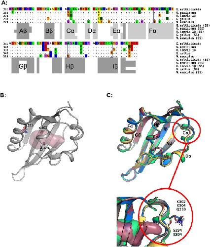 Fig. 5. Sequence and structural model for the G. multiplicata AHR. (A) Sequence alignment produced by Clustal W. Only residues that differ from the caecilian sequence are shown; dots indicate conserved positions. Variable residues that protrude into the modeled binding cavity are boxed. Color scheme for residues: red, acidic; blue, basic; purple, polar; yellow, Cys; brown, aromatic; green, hydrophobic; orange, Ser, Thr; gray, Pro; white, Gly. Secondary structures attributed by DSSPcont (SS) are indicated below: light gray bars for helices and dark gray bars for β-strands. (B) Cartoon representation of the modeled G. multiplicata AHR LBD. Residues that both differ from the high-affinity mouse or chicken AHRs and protrude into the modeled binding cavity are labeled and shown as sticks. The light red shaded area delineates the molecular surface of the binding cavity identified by CASTp. (C) Comparison of cartoon renderings for modeled LBDs of AHRs: magenta for G. multiplicata AHR, green for A. mexicanum AHR, yellow for frog AHR1β, blue for chicken AHR, and gray for mouse AHR. Black labels indicate the conserved secondary structure elements identified by DSSPcont. Magnified inset image depicts position of potentially variable residues that protrude outside the binding pockets but may nonetheless affect binding cavity dimensions (see text, Section 4.1).