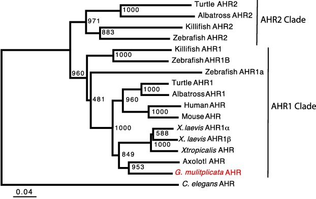 Fig. 1. Phylogenetic analysis of G. multiplicata AHR. Amino acid sequences of bHLH and PAS domains of each AHR sequence were aligned in Clustal X2. A tree was inferred by the Neighbor-Joining method. It was rooted with the C. elegans AHR sequence, an invertebrate ortholog. Numbers at the branch points represent the bootstrap values based on 1000 samplings. Scale bar indicates degree of substitution (4 residues per 100). Accession numbers of the sequences and generic names of the species are found in Supplemental Information, Table S3.