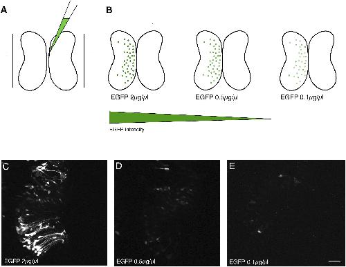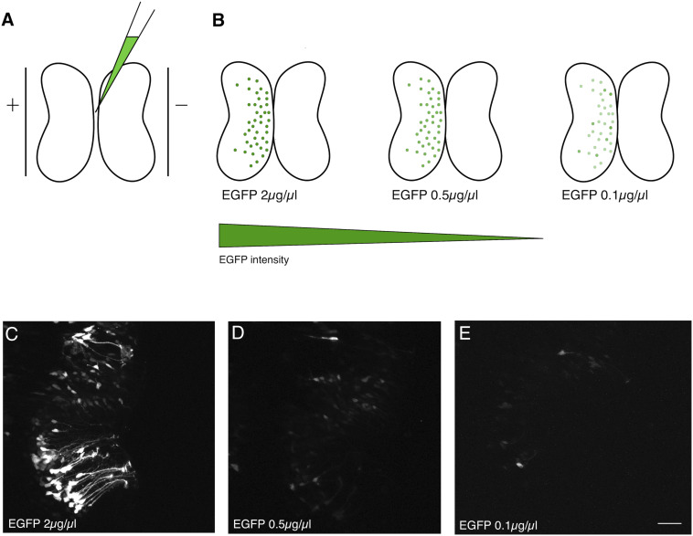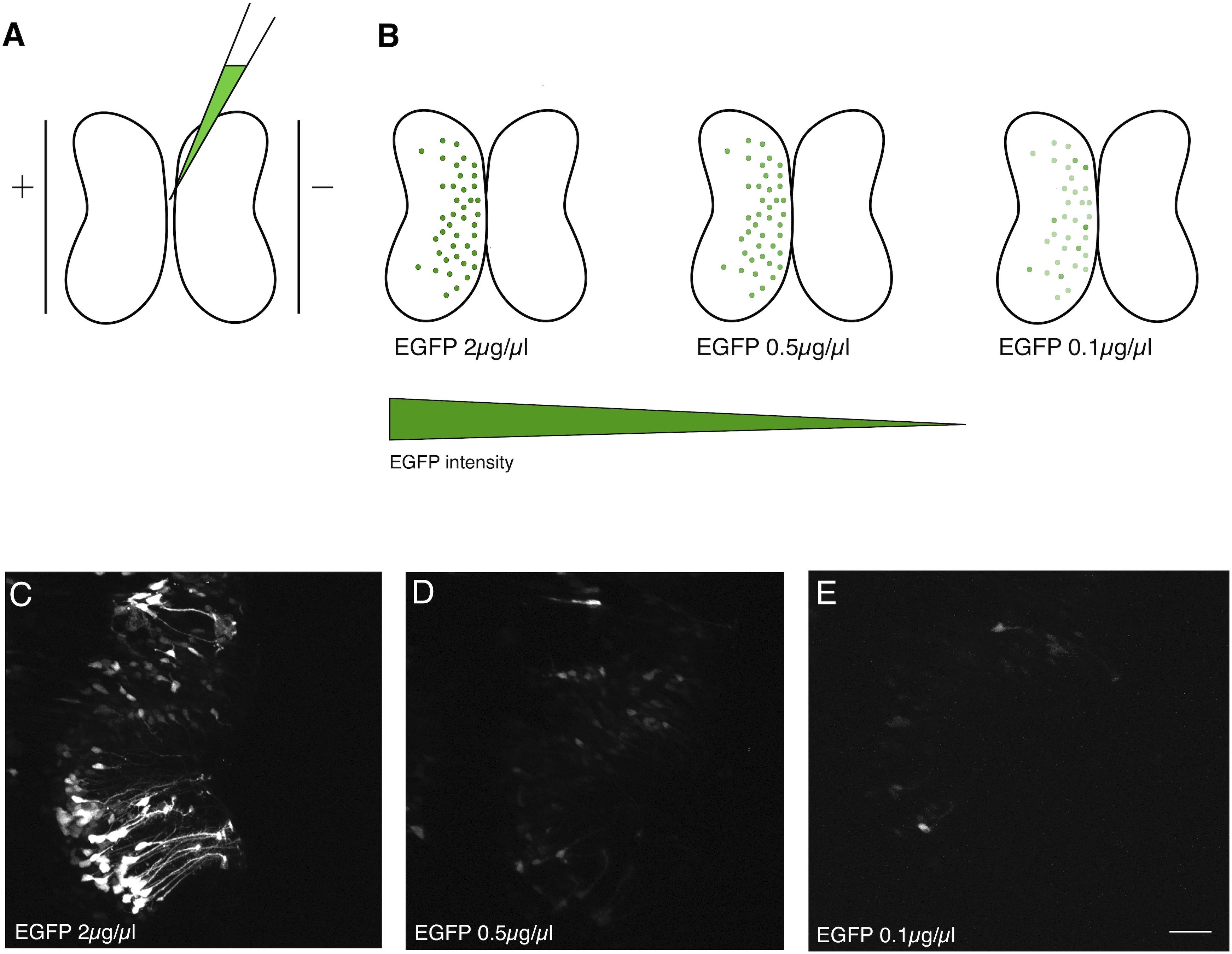 Figure 1. Dilution of electroporated plasmid reduces expression level. (A) Bulk electroporation of the Xenopus optic tectum involves the injection of a plasmid solution into the tectal ventricle followed by passing current pulses across plate electrodes that span the targeted brain region. Transduction occurs on the side toward the positive electrode due to the negative charge of plasmid DNA. (BâE) Reducing the concentration of EGFP plasmid mainly lowers the levels of expression per cell. (CâE) Two-photon z-series projections through the optic tectum of an intact Xenopus tadpole collected using the same laser excitation intensity. (C) At 2 μg/μL a large number of bright cells, especially radial glial progenitors, are labeled. (D) 0.5 μg/μL or (E) 0.1 μg/μL labels fewer cells, which are also much fainter. Scale bar, 50 μm. |