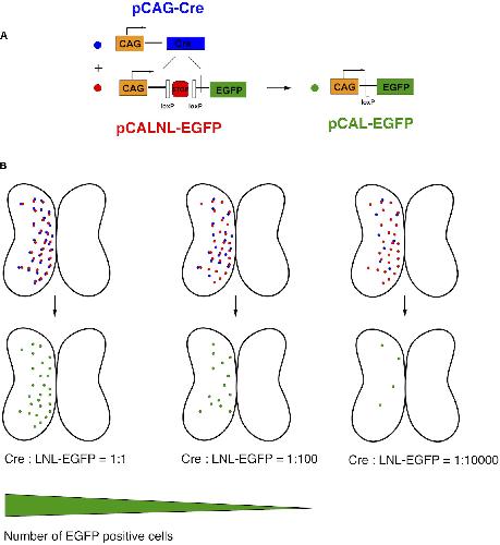 Figure 2. Schematic of CREMSCLE method. (A) Electroporation of large amounts of pCALNL-EGFP containing a floxed neogenin âstop cassetteâ does not lead to EGFP expression unless pCAG-Cre plasmid is co-expressed. The Cre recombinase removes the stop cassette flanked by loxP sites to allow the translation of EGFP. (B) When pCAG-Cre and pCALNL-EGFP are coexpressed in roughly equimolar ratios most cells will express EGFP. As the concentration of pCAG-Cre plasmid is reduced, keeping pCALNL-EGFP levels constant, only the very few cells that express Cre recombinase will activate pCALNL-EGFP to allow high levels of EGFP expression. |