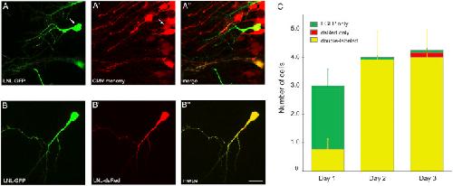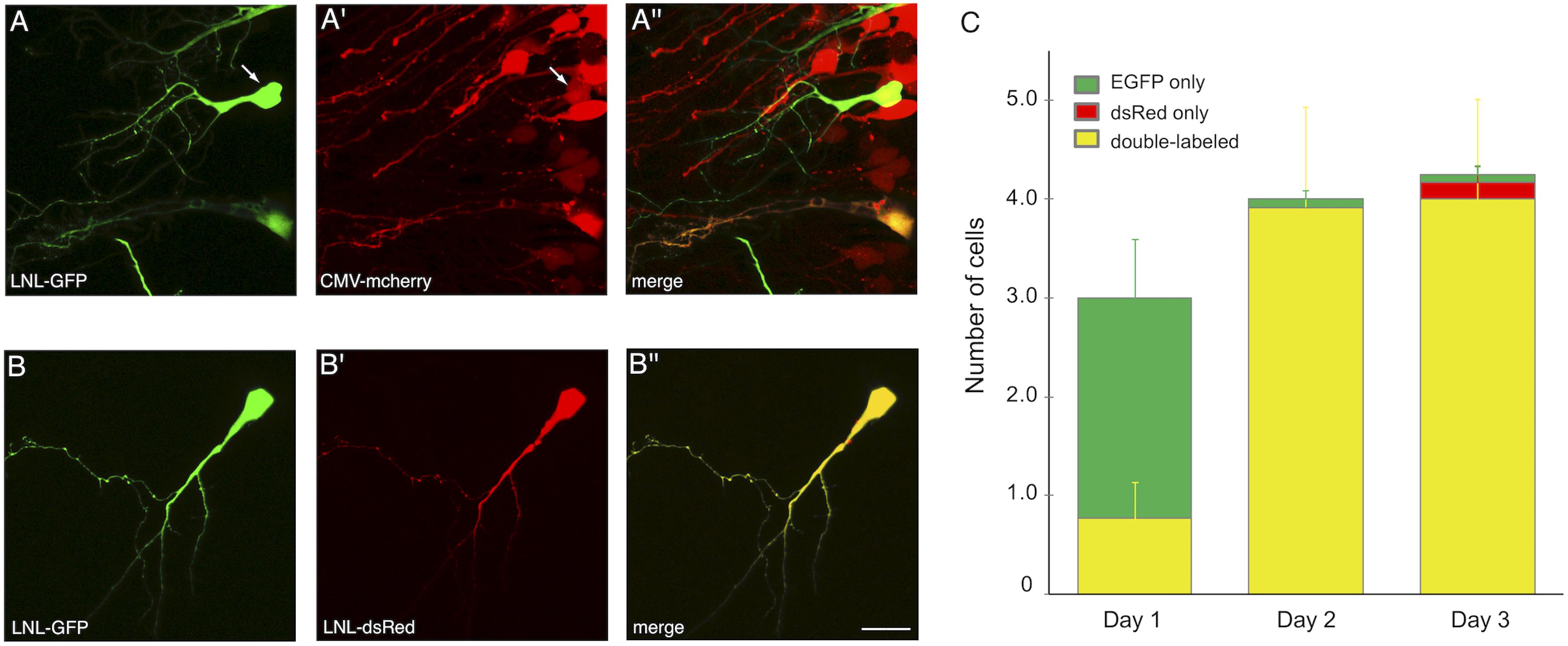 Figure 6. CREMSCLE can be used for co-expression of two proteins. (A,B) Two-photon z-projections of double labeled cells at 3 days post-electroporation. (A) pCAG-Cre (0.5 ng/μL) co-electroporated with pLNL-EGFP (1 μg/μL) and (A′) pCMV-mCherry (3 μg/μL) leads to (A′′) double labeling of sparse EGFP-expressing cells within a field of mCherry-labeled cells. Most cells labeled by EGFP are also positive for mCherry. (B) Co-electroporation of pCAG-Cre (0.1 ng/μL) with pLNL-EGFP (1 μg/μL) and (B′) pLNL-dsRed (3 μg/μL) results in nearly all cells expressing (B′′) both EGFP and dsRed by 3 days post-electroporation. (C) Number of cells per animal that expressed EGFP fluorescence (green), dsRed fluorescence (red), or both (yellow). By 2 days post-electroporation nearly every cell was double-labeled. n = 12 animals. Scale bar, 20 μm. |