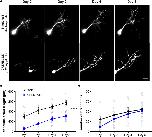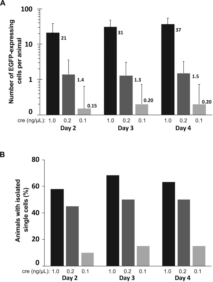 Figure 4. Quantification of labeled cells imaged over three consecutive days. Tadpoles were bilaterally electroporated with 1 μg/μL pCALNL-EGFP mixed with 1.0, 0.2, and 0.1 ng/μL pCAG-Cre plasmid (n = 19, 20, 20) and subsequently screened daily for EGFP-expressing cells from 2 to 4 days post-electroporation. (A) The number of EGFP-positive cells per animal was substantially lower with decreased levels of Cre plasmid. (B) A single isolated cell could be found in nearly half of the animals from the 1.0 and 0.2 ng/μL groups on all days of imaging, but much less frequently in the 0.1 ng/μL group. In this case the 0.2 ng/μL group had the most useful optimization, with sparse expression in a large proportion of animals (high-efficiency of single cell labeling). |