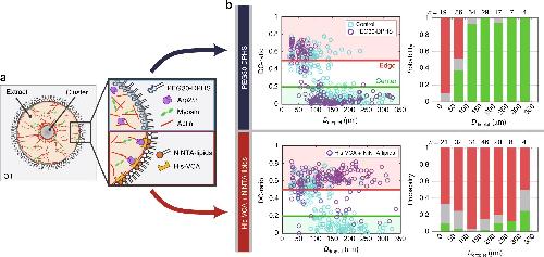 Fig. 3: Modulations of the surface property alters the cluster positioning. The interaction between the droplet boundary and actomyosin networks in the bulk space was modulated by changing the surface property. a Schematic illustration showing alternations of the surface property of droplets. (Top) PEG30-DPHS, a polyethylene glycol (PEG)-based surfactant, will decrease physical interactions of bulk actomyosin networks with the droplet boundary. (Bottom) The VCA domain of WASP conjugated with a histidine-tag was anchored to the droplet boundary via Ni-NTA-conjugated lipids. VCA recruits Arp2/3 and activates its actin nucleation activity. Thus, it was expected that interactions of bulk actomyosin networks with the droplet boundary increased. b The edge-positioned probabilities were compared between different surface properties. Cyan circles show the control data (egg PC). (Top) Passivated droplet surface promoted the cluster centering, whereas (bottom) activated droplet surface promoted the edge positioning. KolmogorovâSmirnov test was applied to the scatter plots of DC-ratio between Ddropletâ= 50 μm â 150 µm (around the transition point in the control experiment). The distributions were significantly different from the control in both conditions (pâ<â0.001). We performed two independent experiments. |