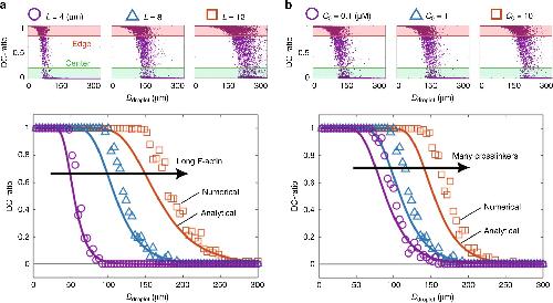 Fig. 7: Numerical simulations and the analytical solution of the tug-of-war model reproduce the two-state cluster positioning. Both numerical simulations and the analytical solution Eq. (2) of the tug-of-war model (Fig. 6) reproduce the results of perturbation experiments (Fig. 5). (Top) In numerical simulations, the time averaged DC-ratio (1/ð0)â«ð00[ð(ð¡)/ð ]dð¡(1/T0)â«0T0â¡[d(t)/R]dt (T0â=â1800âs) for each droplet was determined to statistically evaluate percolation dynamics, displayed as purple dots. (Bottom) Thereafter, the edge probability was determined from the DC-ratio, where a DC-ratio >â0.8 and <0.2 was classified as the âedgeâ and the âcenterâ, respectively. a F-actin length L was changed with the fixed crosslinker concentration (C0â=â1âμM). Purple circles, blue triangles, and orange squares represent numerical simulations with Lâ=â4âμm, Lâ=â8âμm, and Lâ=â12âμm, respectively. Solid curves are the corresponding analytical solutions. b Crosslinker concentration C0 was changed with the fixed F-actin length (Lâ=â8âμm). Purple circles, blue triangles, and orange squares represent numerical simulations with C0â=â0.1âμM, C0â=â1âμM, and C0â=â10âμM, respectively. Solid curves are the corresponding analytical solutions. We defined different DC-ratio thresholds for the edge region from the experiments, because numerical simulations were performed for clusters without their finite volume, in which the centroid of the clusters is possible to reach the droplet boundary. For details, see Supplementary Note 4. |