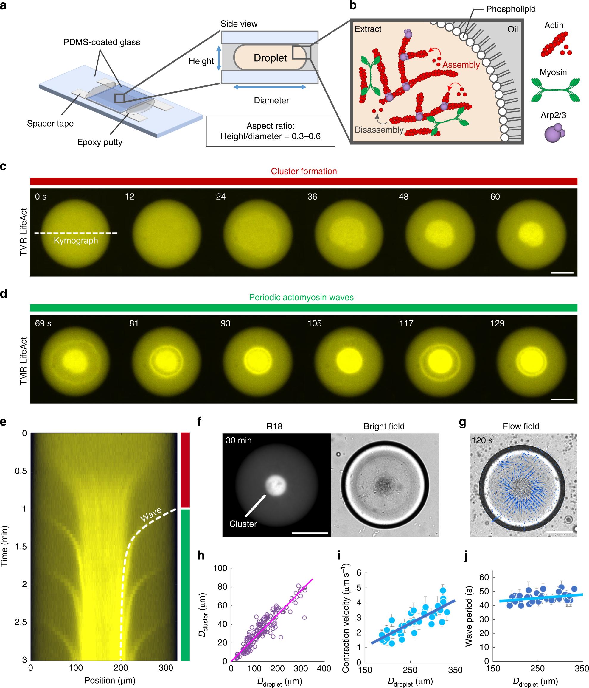 Fig. 1: Cell-sized confinement induces cluster formation and periodic actomyosin waves. a Schematic illustration of the experimental setup. The extract-in-oil droplets were confined in a quasi-two-dimensional space between two polydimethyl siloxane (PDMS)-coated glass slides. The aspect ratio of the height to diameter was fixed at 0.3â0.6. b Magnified view of the droplet boundary. The droplet was surrounded by a single layer of natural phospholipids to mimic the cell boundary. Actin filaments are nucleated by the Arp2/3 complex. Myosin induces actin network contraction. câe Time-lapse images of F-actin dynamics in the extract-in-oil droplet, showing c initial contraction of the F-actin network, followed by d periodic wave propagation, and e the kymograph (Supplementary Movie 1). The broken line shows the theoretical model of the actomyosin wave (Supplementary Note 1). Actin filaments were visualized by tetramethylrhodamine (TMR)-LifeAct. The droplet temperature was elevated from 0 to 20â°C at 0âs to initiate actin polymerization. Periodic actomyosin waves persisted for more than 90âmin (Supplementary Movie 2). We performed >10 independent experiments and confirmed the repeatability. f Fluorescence and the bright-field images of organelles stained with Octadecyl Rhodamine B chloride (R18). Organelles were accumulated by the initial contraction of the actomyosin network, forming a single nucleus-like spherical body (called a âclusterâ). g Velocity field of the actomyosin wave visualized by particle imaging velocimetry. The same sample as c and d was analyzed. h Relationship between the cluster diameter Dcluster and the droplet diameter Ddroplet (nâ=â176). The plot was fitted by Dclusterâ=â0.25Ddroplet (R2â=â0.86; R-squared value for linear regression). We performed two independent experiments. i, j Initial contraction velocity v and period of the wave T displayed along the droplet diameter Ddroplet (nâ=â35). The plots were fitted by vâ=â1.6âÃâ10â2Ddropletâââ1.3 (R2â=â0.69) and Tâ=â2.5âÃâ10â2Ddropletâ+â39 (R2â=â0.12), respectively. Error bars represent standard deviations from the mean velocities and mean periods averaged over three successive waves and wave periods, respectively. We performed two independent experiments. Scale bars, 100âμm. |