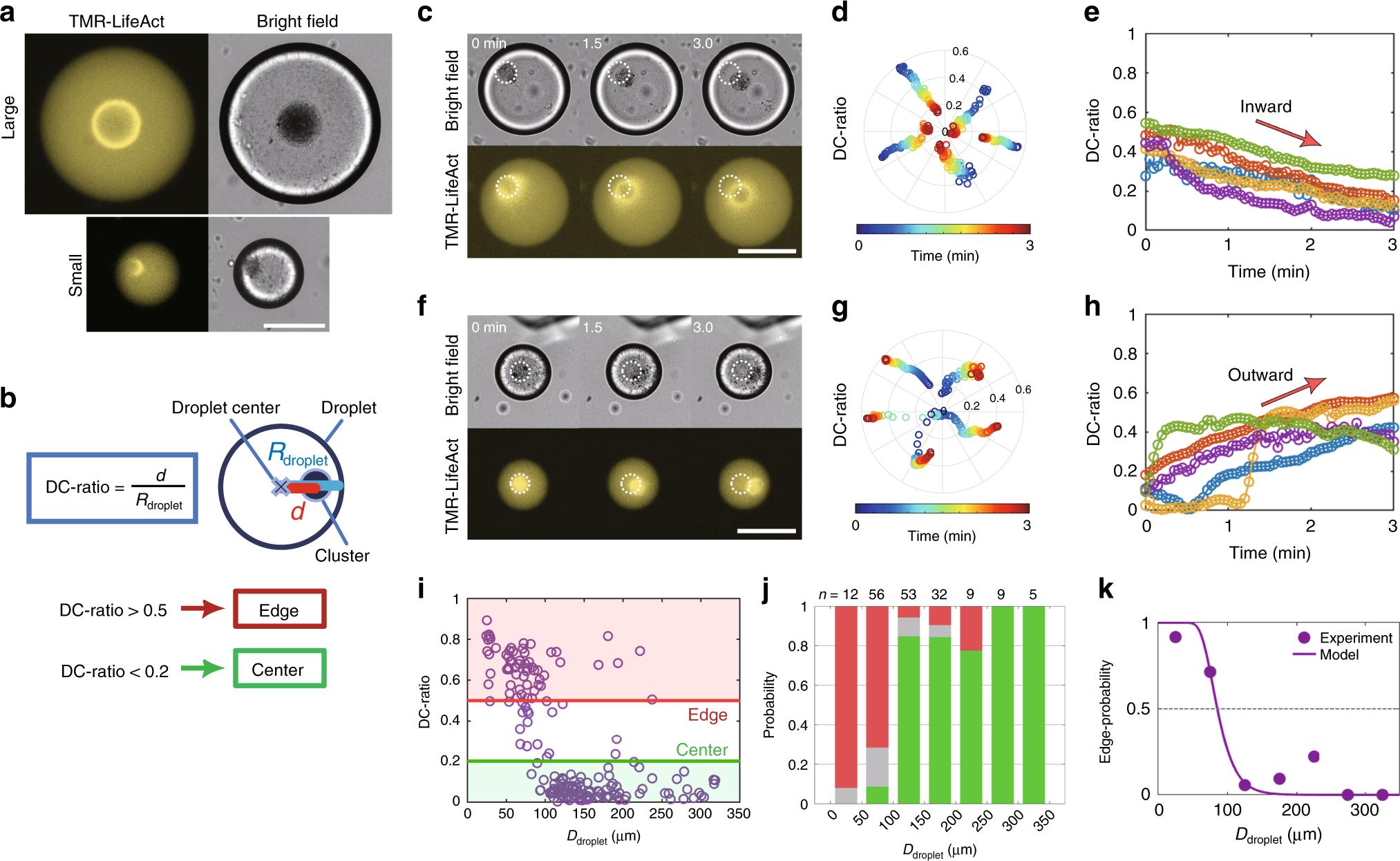 Fig. 2: Cluster position becomes off-centered as the droplet size decreases. a Typical examples of the droplet size dependence. Stable position of the cluster became off-centered in small droplets. Images were acquired 1âh after encapsulation. b Quantification of the cluster positioning symmetry. The polarity parameter DC-ratio is defined as the ratio of d to Rdroplet, where d is the distance from the droplet center to the cluster centroid, and Rdroplet is the radius of the droplet. DC-ratio is classified into two distinct regimes: larger than 0.5 is the âedgeâ and smaller than 0.2 is in the âcenterâ. câh Typical examples of the câe inwardly and fâh outwardly directed motion of clusters after their formation (Supplementary Movies 10 and 11). The time point at which clusters started to move (typically ~1âmin after the cluster formation) is defined as 0 min. The clusters either rested near their initial positions or moved away from the initial positions. Only the clusters that moved are shown. Different colors in e and h indicate different clusters. iâk Droplet size dependence of cluster position. i Raw data of DC-ratio showing two-state positioning. The stable position depends on the droplet diameter. We analyzed bright-field images acquired more than 1âh after encapsulation. We performed two independent experiments (nâ=â176 droplets). j Histogram of DC-ratio for each 50âμm bins summarized from i. DC-ratioâ>â 0.5, 0.5ââ¥âDC-ratioââ¥â0.2, and 0.2â>â DC-ratio are colored in red, gray, and green, respectively. k Edge-positioned probability calculated from j. Filled circles and the solid curve represent experimental values and model fitting of Eq. (2), respectively. Experimental data were fitted by Eq. (2) using Lâ=â6.1âμm and Ïâ=â0.46âs. Transition diameter Dcâ=â85âμm at which edge-probability becomes 0.5 was estimated from the fitting curve. Scale bars, 100âμm. |