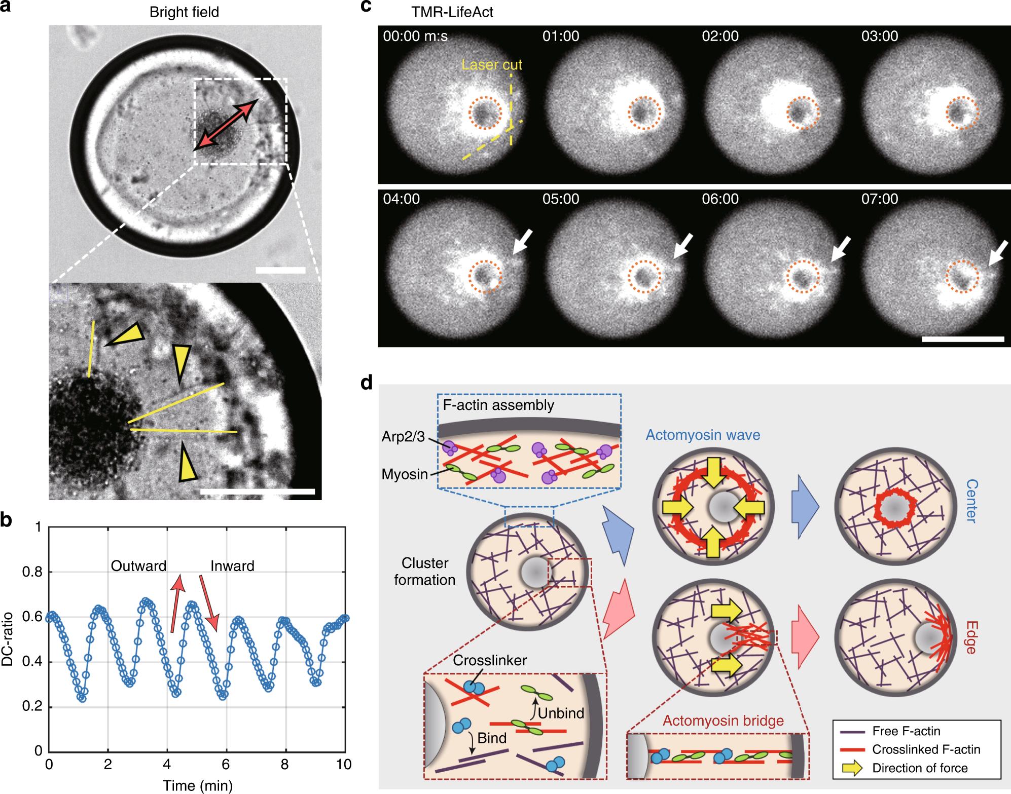 Fig. 4: Actomyosin bridges pull the cluster toward the droplet boundary. a, b Oscillatory motion of the cluster (Supplementary Movie 12). a Snapshot images of the droplet showing the oscillatory motion. (Top) The direction of motion of the cluster is indicated by the red double-sided arrow. (Bottom) The bridges connecting the cluster and the boundary are indicated by yellow arrow heads. b Time course of the cluster motion shown in a. c Actomyosin bridges formed between the cluster and the droplet boundary were cut by a UV pulsed laser. After the laser ablation, the cluster began to move back to the droplet center. After 4âmin has passed, the cluster began to move to the edge again. In the same time, actomyosin bridges reassembled (white arrow). The original position of the cluster is indicated by the red broken circle (Supplementary Movie 14). d The tug-of-war model. (Top) Actomyosin waves push the cluster to the droplet center in every wave period. A magnified view showing F-actin polymerization nucleated by the Arp2/3 complex. (Bottom) Between periodic actomyosin waves, if actomyosin bridges are formed, network contraction pulls the cluster to the edge. A magnified view showing the dynamics of bulk actomyosin between periodic actomyosin waves. If inter-connected actomyosin bridges are formed between the cluster and the droplet boundary, the cluster is contracted toward the edge. Scale bars, 50âμm. |
