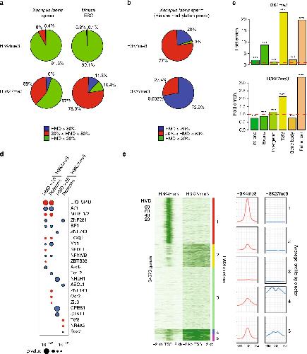 Fig. 3: A fraction of the genome harbours methylated H3K4 and/or H3K27 at the same location in most sperm of a population. a Percentage of the genome with different range of apparent histone H3 methylation density (HMD) on Lysine 4 and 27 in Xenopus Laevis sperm and mouse ESC. b Percentage of H3K4me3 and H3K27me3 peaks with different range of HMD in Xenopus Laevis sperm. c Fold enrichment (observed/random) over 1000 randomisations of peaks with homogeneous histone methylation (HMDâ>â80) at the indicated genomic features; ***: empirical p valueâ<â1eâ3. ICe-ChIP data from two independent replicates were pooled. d Dot matrix showing transcription factors with enriched motifs (y-axis) in the different histone methylation categories (x-axis). Circle size represents âlog10 (p value) of the motif enrichment; and the circle colour indicates whether evidences exist indicating that the corresponding transcription factors is present maternally (blue) or not (red). Retained HMDâ>â80 peaks correspond to sperm histone methylation peaks maintained after extract treatment as in Fig. 5. e Heat map after PAM clustering of promoters (TSS +/â2âkb) according to histone H3-methylation density on Lysine 4 and 27. The plots on the left show the average HMD profile for each cluster. Source data related to a, b, d, and e are provided as Source Data files. |