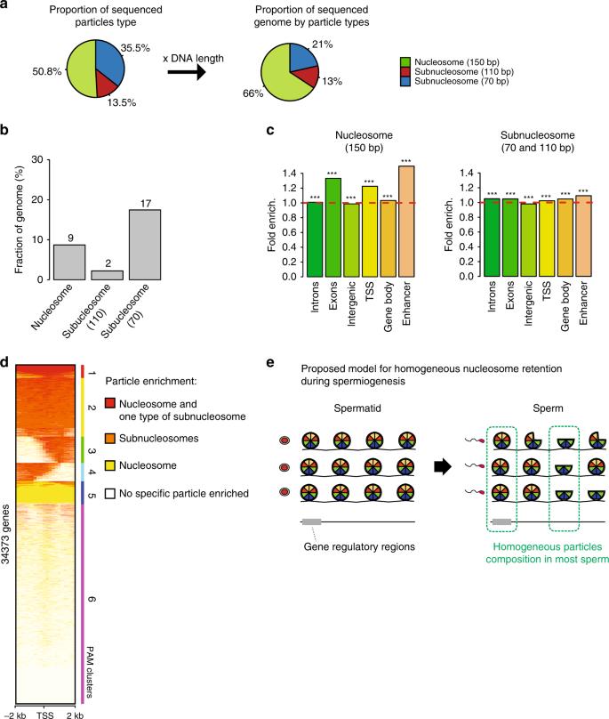 Fig. 2: Nucleosome loss/retention associated with spermiogenesis occurs non-randomly in a large fraction of the genome. a Relative abundance (left) and genome coverage (right) of nucleosomes and subnucleosomes in the sperm chromatin. The left pie chart reports the fraction of DNA fragments from Xenopus Laevis sperm corresponding to each type of particle; the right pie chart reports the fraction of genome covered by each type of particle. b Fraction of the genome with homogeneous particles composition. The bar graph indicates the percentage of the genome that possess nucleosomal or subnucleosomal structure across most sperm of the population sequenced (genome binned in 50 bp windows). c Fold enrichment (observed/random) over 1000 randomisations for homogeneous nucleosomes (left) or subnucleosomes (right) composition at the indicated genomic features; ***: empirical p value < 1eâ3. Input data from two independent replicates were pooled. d PAM (partitioning around medoids) clustering of promoter (TSS +/â2âkb) according to enrichment for nucleosomes or subnucleosomes. e Model of nucleosomes and subnucleosomes distribution in sperm and spermatid. Source data related to a, b and d are provided as Source Data files. |