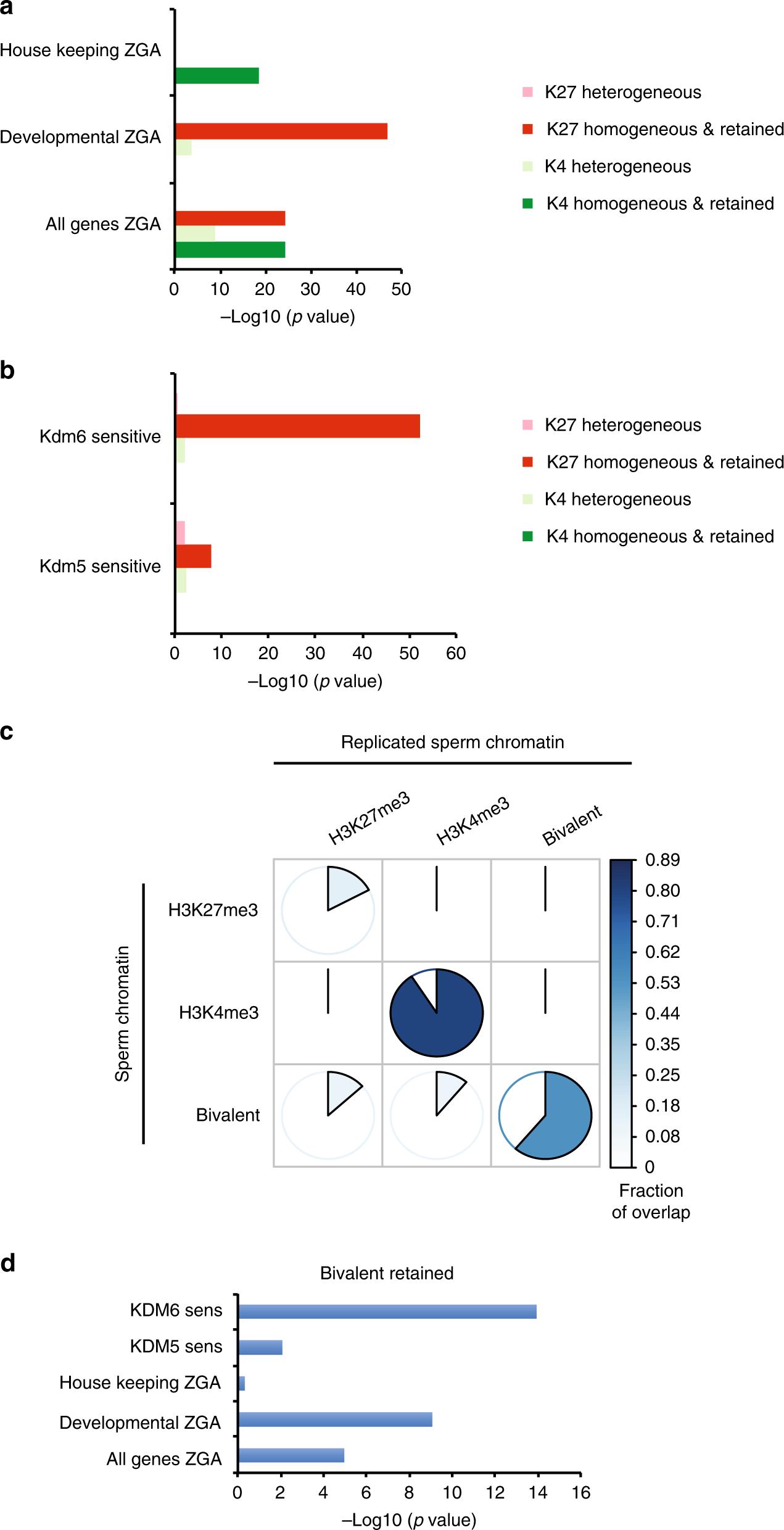 Fig. 6: The homogeneously methylated histone fraction in frog sperm chromatin regulates embryonic gene expression. a Barplot of enrichment p values (âlog10) in set of genes expressed at zygotic gene activation (all-, developmental- and house keeping-ZGA genes) for the presence of different type of H3K4me3 or H3K27me3 sperm peaks. pink and light green barsâ=âenrichment p value for heterogenous (HMDâ<â80) peaks in promoter; red and green barsâ=âenrichment p value for homogeneous (HMDâ>â80) peaks in promoter that are also retained after replication. P values determined by the Ï2 proportion test evaluating if the proportion of gene of interest is higher (alternativeâ=ââgreaterâ) than the genome-wide proportion (i.e., expected proportion). b Barplot of enrichment p values (âlog10) in set of genes whose embryonic expression is sensitive to the presence of histone H3K4 demethylase (Kdm5b) or histone H3K27 demethylase (Kdm6b) at fertilisation2 for the presence of the aforementioned sperm peaks categories. P values are obtained as in a. c Pie chart indicating the percentage of the homogeneously methylated histone present in sperm that are retained after egg extract-mediated replication. Three type of sperm peaks are considered: homogeneous for H3K27me3 only, homogeneous for H3K4me3 only and homogeneous for H3K27me3 and H3K4me3 (bivalent). The area of the coloured sector (together with the colour) indicates the fraction of the overlap between each pair-wise comparison. d Barplot of enrichment p values (âlog10) in various set of genes for the presence of a homogeneous bivalent H3K4me3 and H3K27me3 retained after replication. P values are obtained as in a. HMD are from data pooled from two independent replicates. Peaks retention/lost are consensus from three independent replicates. Set of kdm5 and kdm6 sensistivite genes are from three independent replicates. |