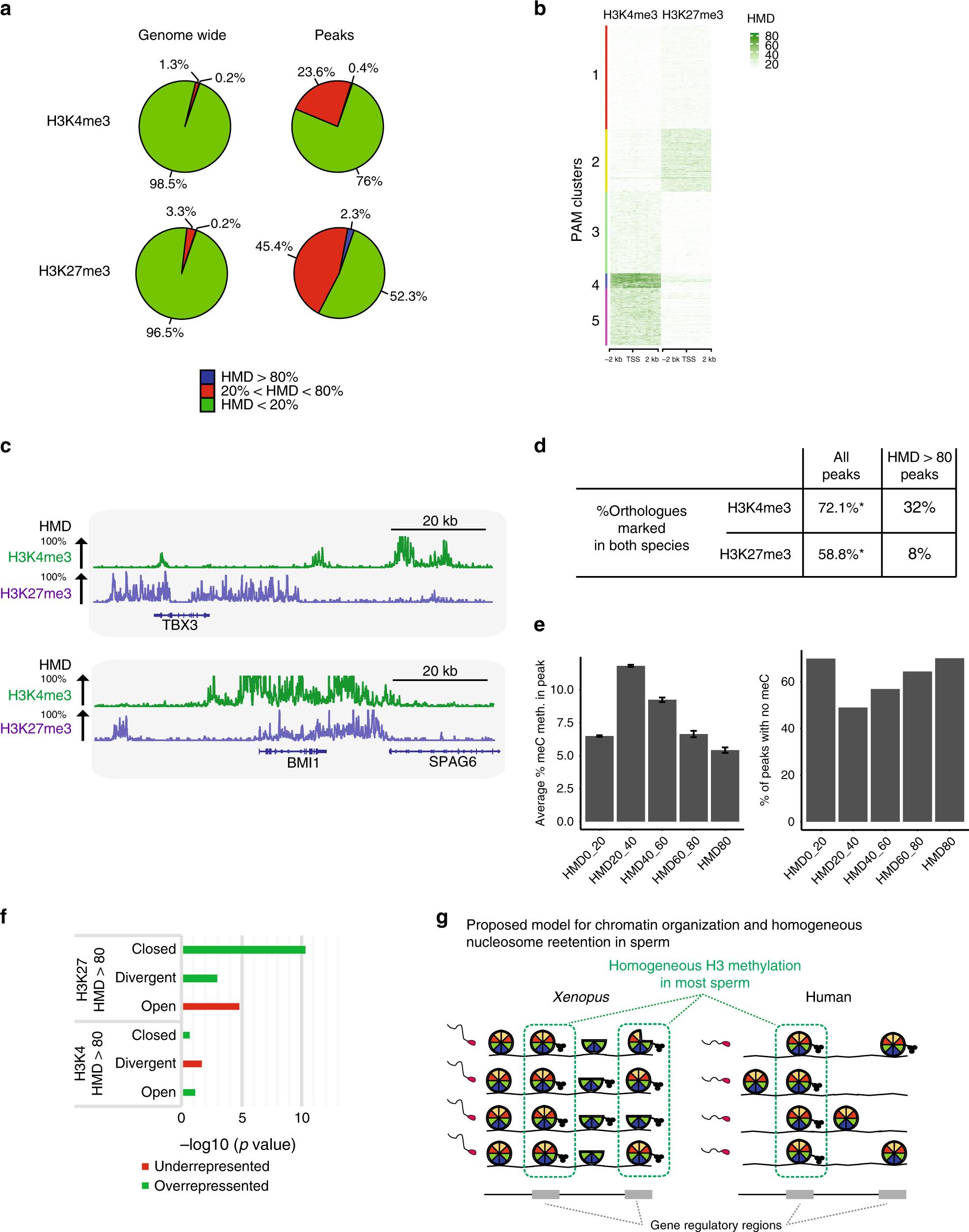 Fig. 7: Homogeneous retention of methylated nucleosome in a human sperm population. a Percentage of the genome (left) and percentage of peaks (right) with different levels of H3K4 or H3K27 methylation density in human sperm. b PAM clustering of H3K4 and H3K27 HMD levels at promoter regions (TSS +/â2âkb) in human sperm. c Genome browser screenshots of TBX3 and BMI1 HMDs in human sperm. d Percentage of gene orthologues with peaks of histone methylation in both human and Xenopus sperm. e Barplots of the average percentage (%) of 5mC methylation at H3K27me3 peaks stratified by methylation level (left); error bars: sem; barplot of the percentage of H3K27me3 peaks showing absence of 5mC methylation (right) (5mC methylation: single-sperm bisulfite sequencing data from ref. 31). f Barplots indicating âlog10 (p value) for enrichment of sperm TSSs with HMDâ>â80 for H3K4 or H3K27 in set of genes with TSSs showing different chromatin accessibility level in eight cell embryos (open and closed corresponds to TSSs open or closed in all cells of a eight cell embryos), whereas divergent corresponds to TSSs either open or closed in different cells (ATAC-seq data from ref. 31); p values determined by Ï2 proportion test evaluating if the proportion of gene of interest is higher (green) or lower (red) than the genome-wide proportion (i.e., expected proportion). g Model of epigenetic homogeneity in Xenopus and human sperm. The cartoon summarises the observed trends in retention of modified histones across the genome in those species. Source data related to b and e are provided as Source Data files. |