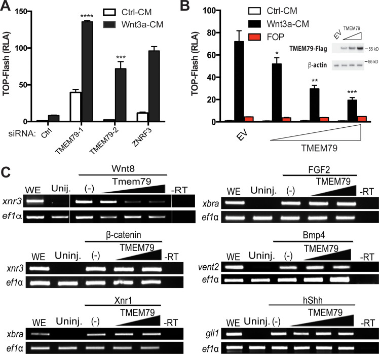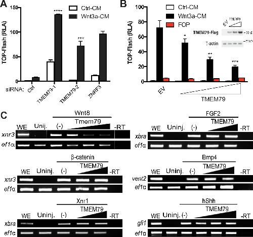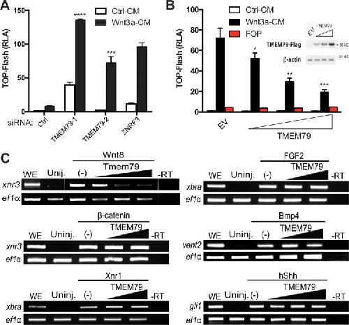 Figure 2. TMEM79 is a specific inhibitor of Wnt/β-catenin signaling.(A) siRNA depletion of TMEM79 enhances top-flash reading with or without Wnt3a. A ZNRF3 siRNA serves as a positive control. CM, conditioned medium. TOP-Flash is quantified using RLA (relative luciferase activity), with the control set as 1. (B) TMEM79 dose-dependently suppresses top-flash. FOP, a negative control luciferase reporter. EV, empty vector. Inset: immunoblot of TMEM79 proteins, with β-actin as loading control. (C) In animal pole explants of Xenopus embryos, TMEM79 inhibits expression of xnr3 induced by Wnt8 but not by β-catenin. TMEM79 does not inhibit expression of target genes (Xbra, vent2, and Gli1) induced by Nodal, FGF, BMP, or Shh, respectively. Ef1α: RT-PCR/loading control; WE, whole embryo; Uninj, uninjected embryo; -RT: no reverse transcriptase. In this and all other figures, gradient bars symbolize different doses of DNA in transfection or mRNA in embryo injection; error bars represent SEM from at least three independent experiments; *p<0.05, **p<0.01, and ***p<0.001, ****p<0.0001 are based on studentâs t-tests.Figure 2âsource data 1. Raw data for Figure 2.Figure 2âfigure supplement 1. TMEM79 is a specific inhibitor for Wnt/β-catenin signaling.(A and B) TMEM79 affects neither the cAMP/PKA pathway, assayed by a CRE (cAMP responsive element)-driven reporter, or the EGF/EGFR pathway, assayed by an SRE (serum response element)-(driven reporter). (C and D) Depletion of TMEM79 by siRNAs affects neither the CRE- or SRE-driven reporter. (E) TMEM79 inhibits the TOP-Flash reporter induced by Wnt3a but not that induced by a GSK3 inhibitor (GSK3i). (F) Relative mRNA levels of TMEM79 in HEK293 cells transfected with indicated siRNA.Figure 2âfigure supplement 1âsource data 1. Raw data for Figure 2âfigure supplement 1. |