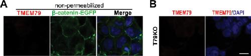 Figure 4—figure supplement 1. TMEM79 is an ER-resident protein.(A) TMEM79 is not detectable by the TMEM79 antibody without cell permeabilization. Note that the antibody (Key Resources Table) recognizes the TMEM79 C-terminus (Figure 1D), which is either in the ER lumen, or extracellular if TMEM79 were to be on the PM. This result is consistent with TMEM79 being an ER- but not PM-resident protein. (B) T79KO cells lack TMEM79 staining completely, demonstrating specificity of the TMEM79 antibody for immunostaining. Scale bar = 10 μm. |
