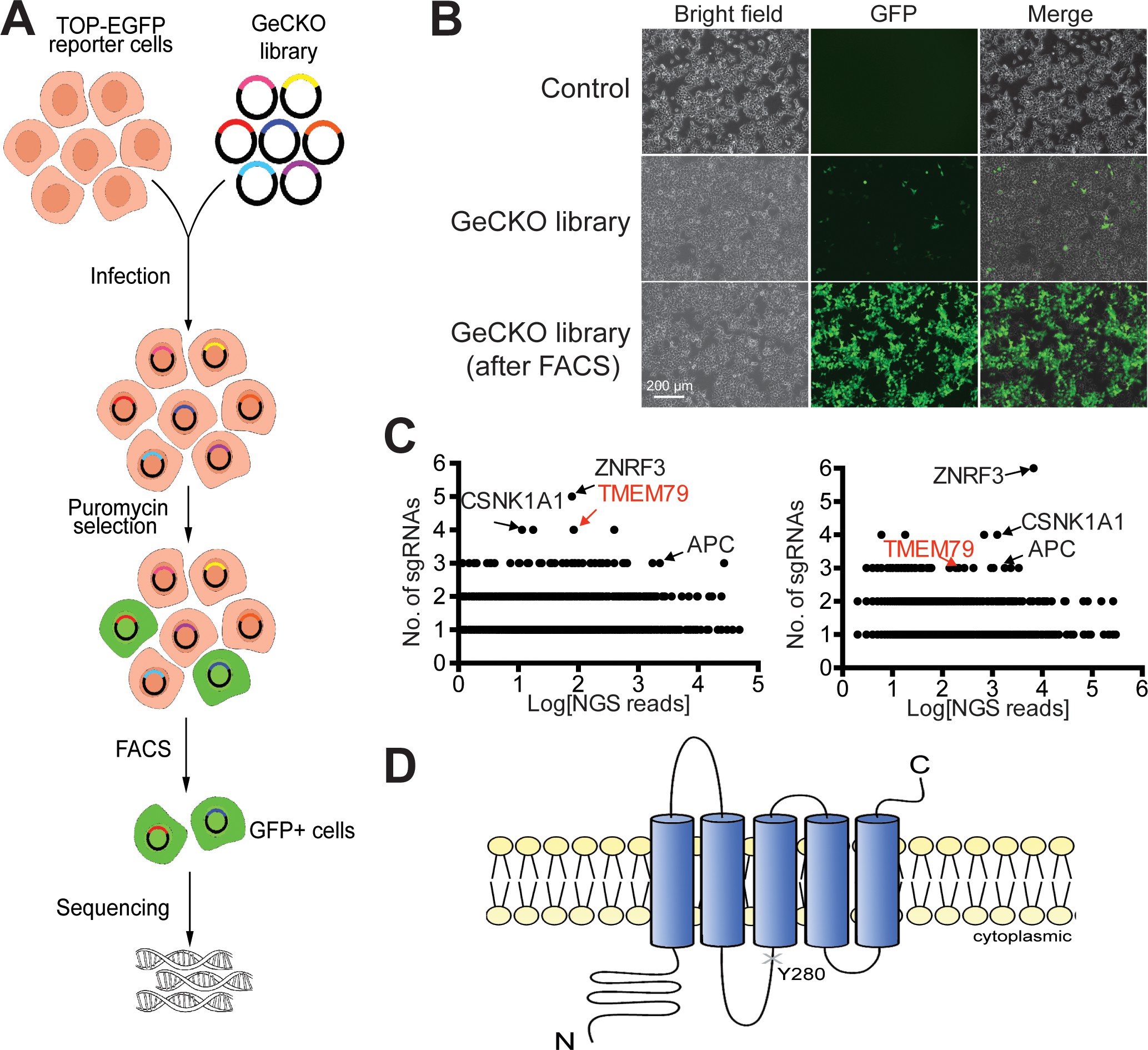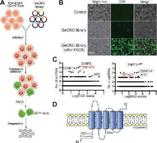 Figure 2. Identification of TMEM79 as an inhibitor of Wnt/β-catenin signaling through genome-wide loss-of-function screening using the CRISPR-Cas9 system. (A) An outline of the screening strategy for negative components of Wnt/β-catenin signaling using a HEK293T-TOP-EGFP reporter line. (B) Representative images of the reporter cells with or without infection of the GeCKO library. GFP+ cells were enriched by FACS. Scale bar, 200 µm. (C) Scatter plots showing candidate genes corresponding to sgRNAs enriched. Results of two independent screens are shown. Each dot represents a candidate gene. Y-axis: number of unique sgRNAs for each gene (six sgRNAs per gene in the GeCKO library). X-axis: sgRNA NGS (next generation sequencing) reads for each gene. (D) Schematic diagram of TMEM79 protein (predicted). Y280*, a nonsense mutation at tyrosine 280 coded by the matted allele in mice. |