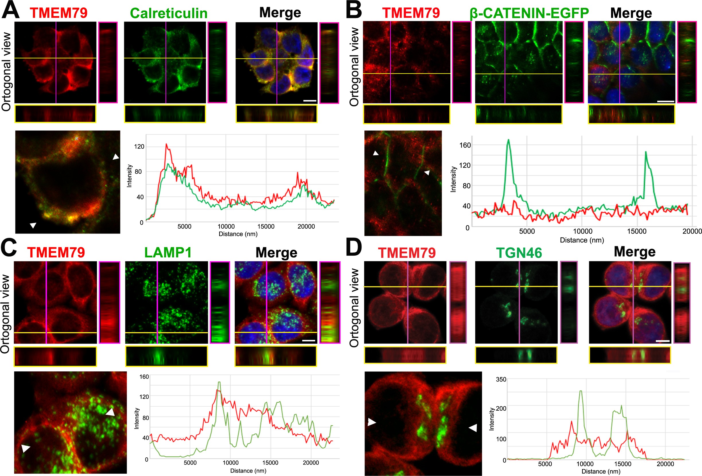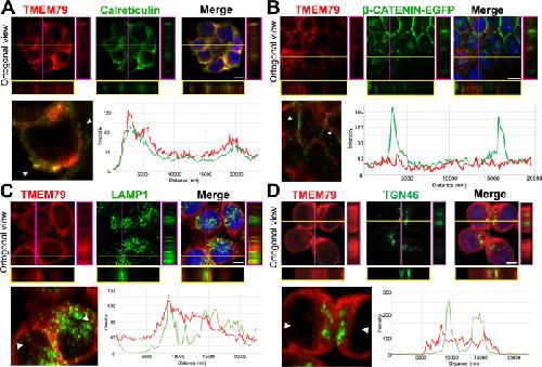 Figure 4. TMEM79 is likely an ER-resident protein. (A to D) Immunofluorescence microscopy of endogenous TMEM79 (red) with ER, PM, lysosome, and Golgi markers (green), respectively, with the nucleus labeled by DAPI (blue). The z-axis is shown on right and underneath. The white scale bar represents 10 µm. Fluorescence intensity of TMEM79 and the respective marker is measured between the two arrowheads in the lower left panel and plotted at lower right. (A) TMEM79 is localized at the ER. TMEM79 and calreticulin (an ER marker) overlap extensively in images and intensity traces. (B) TMEM79 is not present at the PM, which is visualized by β-catenin-EGFP (produced from the endogenous β-catenin gene with an in-frame knock-in of the EGFP gene, see Materials and methods). Note that β-catenin is predominantly localized at the PM in epithelial cells. (C) Some TMEM79 is observed at the lysosome. TMEM79 and LAMP1 (lysosomal-associated membrane protein 1) overlap occasionally. (D) TMEM79 is hardly observed at the Trans Golgi and exhibits little or minor overlap with TGN46 (trans-Golgi marker 46). |