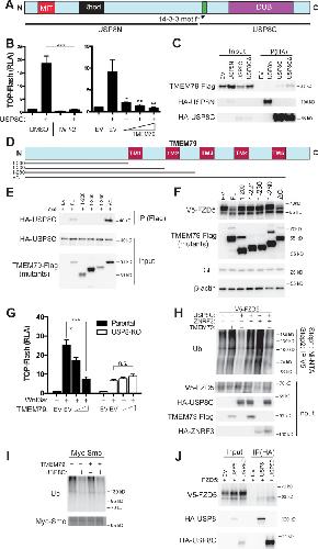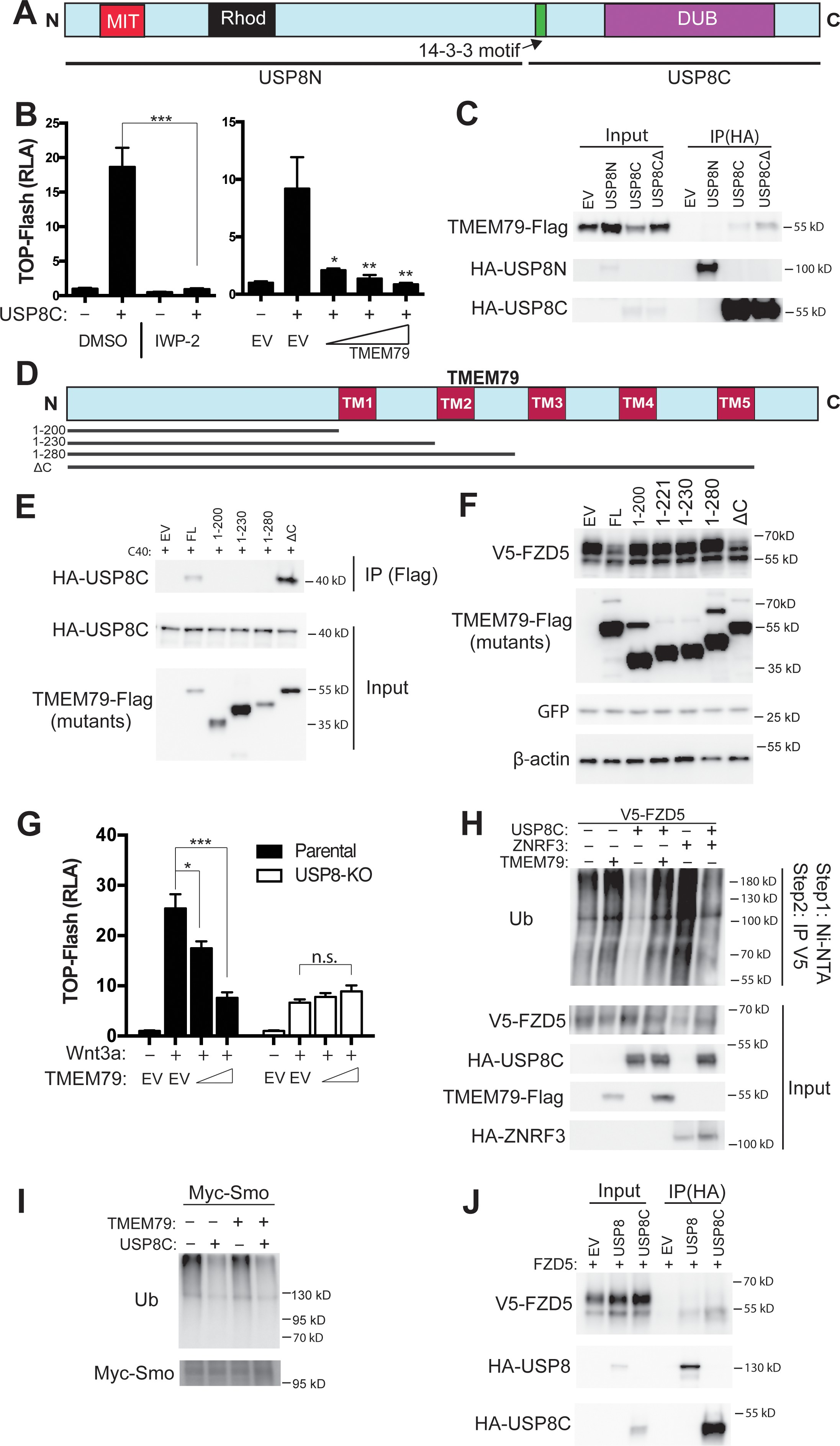 Figure 5. TMEM79 inhibits Frizzled (FZD) deubiquitination by USP8. (A) Schematic diagram of USP8. USP8N, USP8 N terminal fragment; USP8C, USP8 C terminal fragment. Known domains including DUB and a 14-3-3-binding motif are depicted. (B) Activation of Top-Flash by USP8C is inhibited by IWP-2 or by TMEM79. (C) TMEM79 is co-IPed by USP8C or USP8CÎ (with the 14-3-3 binding motif deleted), but not by USP8N, suggesting that USP8C (but not its 14-3-3 binding motif) is involved in TMEM79 interaction. (D) Schematic diagram of TMEM79 and its deletion mutants. Five transmembrane (TM) regions are depicted. (E) TMEM79 (FL, full length) or TMEM79-ÎC, but none of the other TMEM79 mutants, co-IPs USP8C. (F) TMEM79 or TMEM79-ÎC, but none of the other TMEM79 mutants, down-regulates the level of mature FZD5. (G) The Wnt response in USP8-KO cells is reduced and is not inhibited by TMEM79. (H and I) TMEM79 inhibits USP8C deubiquitination of FZD5 (H), but not SMO (I). HEK293T cells were cotransfected with V5-FZD5 and His-ubiquitin, and in combination with USP8C, TMEM79 or ZNRF3 as indicated. Ubiquitinated proteins were precipitated by Ni-NTA (nickel-nitrilotriacetic acidâagarose beads for His tag pull-down), followed by wash in 7M urea to fully disassociate all protein complexes. Ubiquitinated V5-FZD5 was then precipitated by anti-V5 agarose beads. These multiple steps ensured detection of ubiquitinated V5-FZD5 only, but not V5-FZD5-associated proteins that are also ubiquitinated. Levels of ubiquitinated FZD5 were increased by TMEM79 or ZNRF3 co-expression whereas USP8C deubiquitinated FZD5. TMEM79 inhibited USP8C deubiquitination of FZD5 and restored FZD5 ubiquitination (H). USP8C also deubiquitinated SMO, but TMEM79 had no effect on USP8C deubiquitination of SMO (I). (J) USP8 or USP8C preferentially co-IPs the immature form of FZD5 (the lower band). |