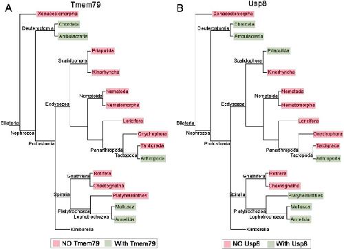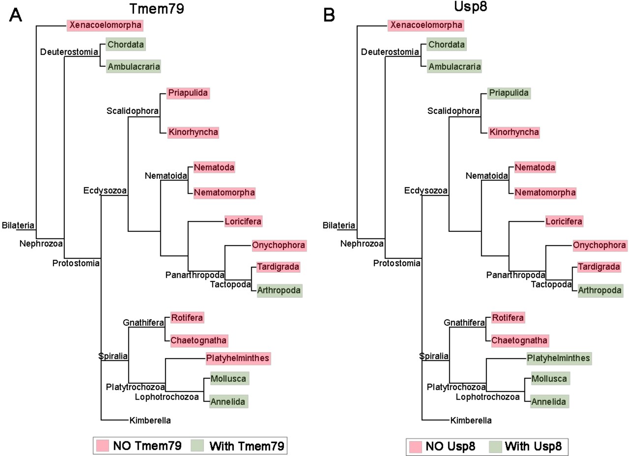 Figure 9. The phylogenetic preservation or loss in bilateria of Tmem79 (A) and Usp8 (B).Tmem79 and Usp8 are present throughout deuterostomes while exhibit frequent and similar losses in protostomes. Note that both genes are found in cnidaria and thus was likely present in the common cnidarian and bilaterian ancestor (Figure 1—figure supplement 1). Preservation of Tmem79 in protostomes is always accompanied by preservation of Usp8, but not vice versa. One such example is in arthropods: Tmem79 is absent but Usp8 is present in Drosophila while the Acari has Tmem79 and Usp8. Neither gene is found and was probably lost in Xenacoelomorpha. |