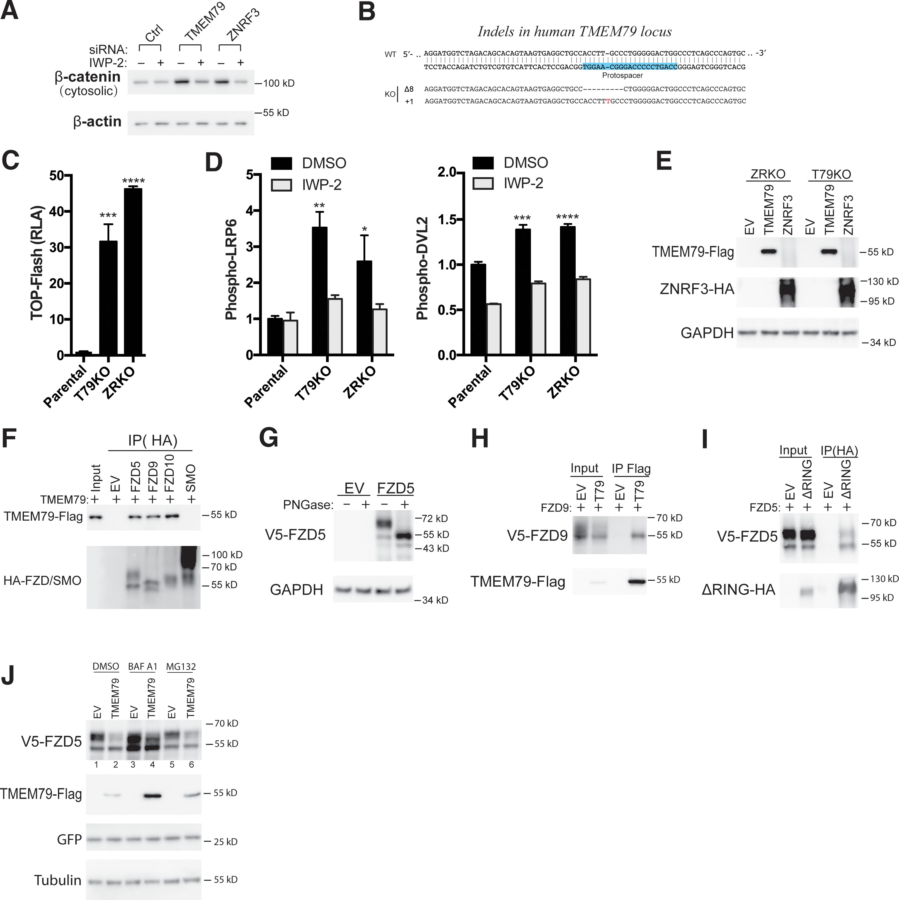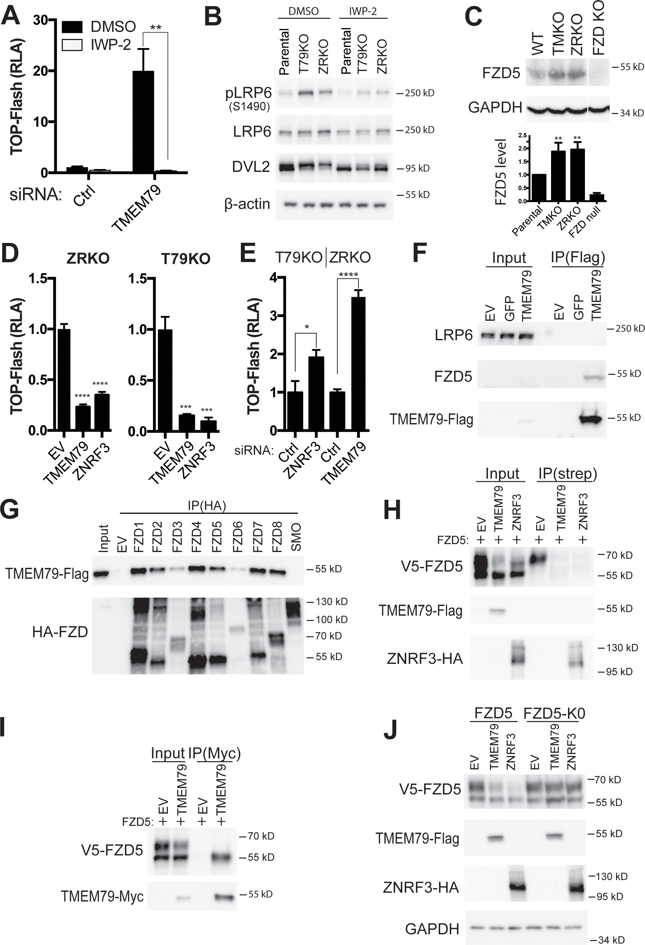 Figure 3. TMEM79 down-regulates the Frizzled (FZD) protein level at the cell surface independent of ZNRF3/RNF43. (A) Porcupine inhibitor IWP-2 abolishes Top-Flash activities induced by a TMEM79 siRNA. (B) Levels of phospho-LRP6 and phospho-DVL2 are elevated in T79KO and ZRKO cells, and are reduced/reversed by IWP-2, as detected by a phospho-LRP6 (S1490) antibody and the upper DVL2 protein band, respectively. (C) Endogenous FZD5 levels are elevated in T79KO and ZRKO cells comparably. FZD null cells (knockout of FZD1-10) (Eubelen et al., 2018) serve as control for immunoblotting specificity. (D) TMEM79 and ZNRF3 inhibit Wnt signaling independent of each other. (E) siRNA depletion of ZNRF3 or TMEM79 further elevates TOP-Flash activities in T79KO or ZRKO cells. (F) Co-IP of TMEM79 (Flag-tagged) with endogenous FZD5 but not LRP6. (G) TMEM79 is co-IPed with each FZD (FZD1 to 8) but not SMO, and with FZD9 and FZD10 but not SMO (Figure 3âfigure supplement 1F). (H) TMEM79 reduces the surface level of FZD5 as indicated by cell surface protein biotinylation assay. Surface proteins were labeled by membrane-impermeable biotin and isolated by streptavidin agarose (strep). Either TMEM79 or ZNRF3 reduces the upper band of FZD5 (the matured and biotinylated form) in input and streptavidin-precipitates, suggesting that TMEM79 or ZNRF3 diminishes surface level of FZD5. Note surface-biotinylation of ZNRF3 but not TMEM79, indicating that TMEM79 is not at the plasma membrane. (I) TMEM79 co-IPs the immature form of FZD5. (J) FZD5-K0 is resistant to down-regulation by TMEM79 or ZNRF3. |