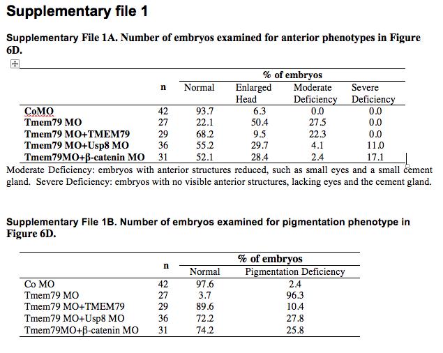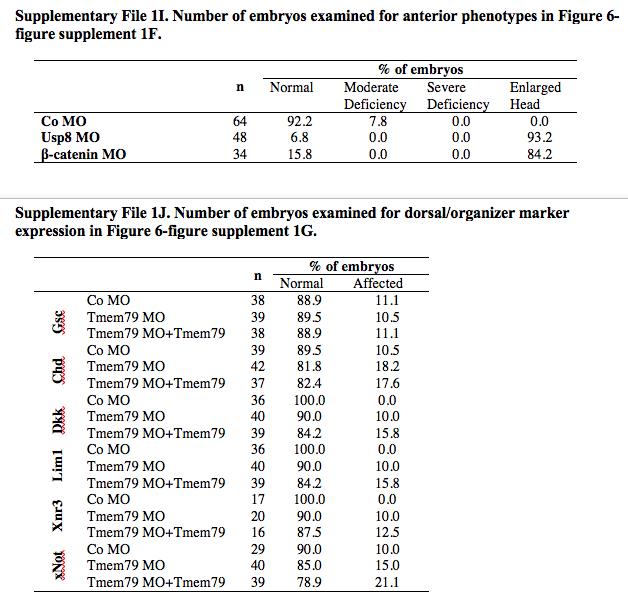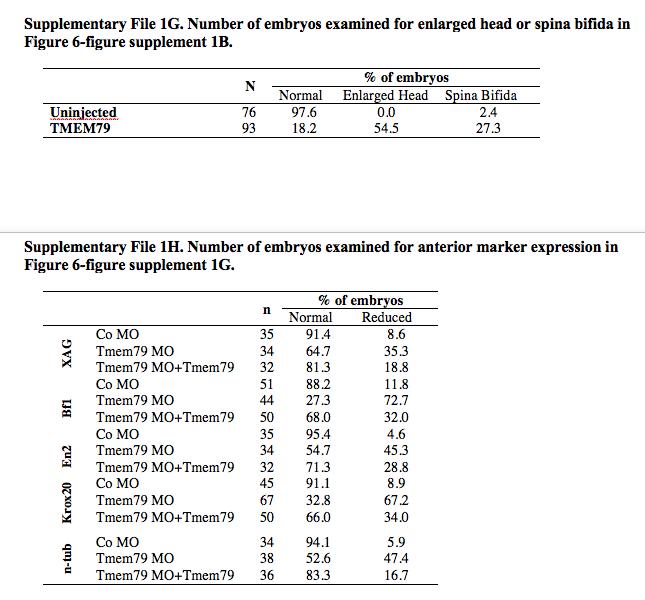 Supplementary file 1. Table 1G. Number of embryos examined for enlarged head or spina bifida in Figure 6âfigure supplement 1B. Table 1H. Number of embryos examined for anterior marker expression in Figure 6âfigure supplement 1G. |