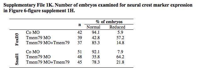 Supplementary file 1. Table 1K. Number of embryos examined for neural crest marker expression in Figure 6—figure supplement 1H. |