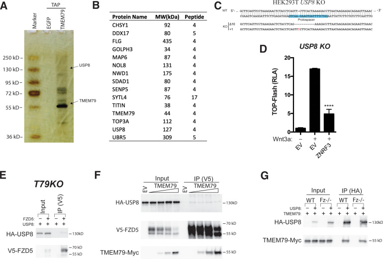Figure 5âfigure supplement 1. Tandem affinity purification-coupled mass spectrometry identifies USP8 as a TMEM79 binding partner. (A) Tandem affinity purified proteins were resolved by SDS-PAGE and visualized by silver staining. The same tandem IP procedure of EGFP-expressing cell extracts serves as a negative control. The TMEM79 bait protein is marked, as is the gel fraction that corresponds to the molecular weight of USP8. (B) List of candidate proteins from tandem affinity purification-coupled mass spectrometry. Note that only a few visible fractions/bands in A were excised and pooled together for mass spectrometry analyses (see Materials and methods). The list is therefore not intended to be a comprehensive representation of all candidate TMEM79-associated proteins. (C) Genomic DNA sequencing showing indel (frame shift) mutations of USP8 alleles in a USP8 KO clone picked/used. Two clones were picked and tested with indistinguishable results (data not shown). (D) ZNRF3 inhibits top-flash reporter activity effectively in USP8 KO cells. (E) FZD5 co-IPs USP8 in the absence of TMEM79 in T79KO cells. (F) Overexpression of TMEM79 does not affect FZD5 co-IP of USP8. This experiment largely rules out a scenario that TMEM79 inhibits USP8 deubiquitination of FZD5 by competing with FZD5 for USP8. TMEM79 is also co-IPed by FZD5. (G) USP8 co-IPs TMEM79 in in FZD null cells. |