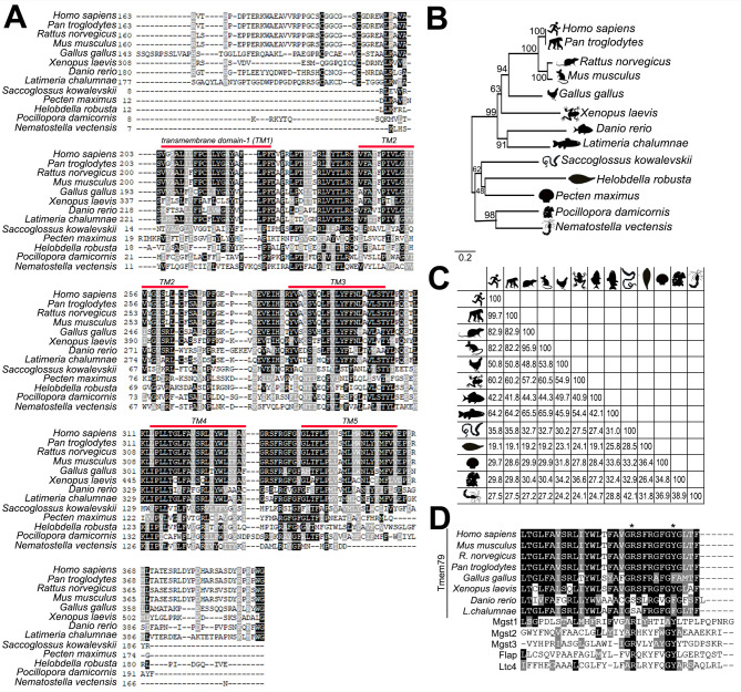 Figure 1—figure supplement 1. Evolutionary comparison of Tmem79 proteins in vertebrates, protostomes, and cnidarians.(A) ClustalW alignment of TMEM79/Tmem79 proteins from human (Homo sapiens), chimpanzee (Pan troglodytes), rat (Rattus norvegicus), mouse (Mus musculus), chicken (Gallus gallus), frog (Xenopus laevis), zebra fish (Danio rerio), coelacanth (Latimeria chalumnae), hemicordate (Saccoglossus kowalevskii), great scallop (Pecten maximus), leech (Helobdella robusta), cauliflower coral (Pocillopora damicornis), and sea anemone (Nematostella vectensis). Black and grey represent identical and conservative amino acid residues, respectively. Note that the amino terminus before the transmembrane domain 1 (TM1) is poorly conserved and shown only partially. The predicted Tmem79 of Nematostella vectensis appears to lack the 5th transmembrane domain (TM5) that is present in other species listed. Accession numbers for the Tmem79 sequences in the alignment are listed in Materials and methods section. (B) The phylogenetic tree showing homology among Tmem79 proteins from species presented in A based on Neighbor-Joining phylogenetic methods. Distances in the cladogram are derived from amino acid substitutions. (C) Orthologous comparisons of identity of Tmem79 proteins among species listed in A using ClustalW alignment. (D) ClustalW alignment of vertebrate TMEM79/Tmem79 proteins from human, chimpanzee, rat, mouse, chicken, frog, zebra fish, and coelacanth with mouse MAPEG family members Mgst1, Mgst2, Mgst3, Flap and Ltc4s (Emrick et al., 2018; Saunders et al., 2013). Asterisk indicates two conserved residues within the region of limited sequence similarity corresponding to mouse Tmem79 R332 and Y339. |
