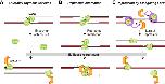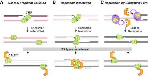 Figure 1. Possible models of CRL2Lrr1 recruitment upon DNA replication termination. (A) Okazaki fragment collision model. Upon CMG encounter with the Okazaki fragment of the opposing fork, CMG undergoes a conformational change that triggers CRL2Lrr1 recruitment. (B) Replisome interaction model. When two replication forks meet, the two CMG helicases interact, creating a structure that recruits CRL2Lrr1. In this model, CMGs reel in the template strands to complete DNA synthesis (gray arrows). In an alternative version of this model (not depicted), CMGs pass each other and interact with other protein components of the converging fork (e.g., PCNA), leading to CRL2Lrr1 recruitment. (C) Repression model. A protein or DNA structure (pink circle) suppresses binding of CRL2Lrr1 to CMG at the elongating replication fork. When forks converge, the repressive protein or DNA structure is lost, leading to CRL2Lrr1 recruitment.