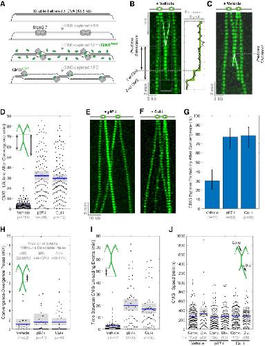 Figure 2. CMG complexes pass one another when unloading is prevented. (A) Scheme of the single-molecule imaging experiment. Green ovals represent GINSAF647. (B) CMGs converge and are rapidly unloaded. λ DNA was replicated in the presence of DMSO (vehicle) and imaged every 30 sec. Images of individual molecules were stacked to create kymograms. CMGs were false-colored in green. The signal in the region of interest (gray box) was integrated and is shown in the box at the right. The moment of CMG unloading was determined by the stepwise drop in signal intensity. Scale bars are shown at the bottom left. (C) Same as B but depicting an example in which CMGs are unloaded after divergence. (D) CMG lifetime after replisome convergence in the indicated conditions from C, E, and F. A schematic of the event being quantified is shown in green. (E) Same as B, but NPE contained p97-i. Note that rightward-moving CMG is brighter than the leftward-moving molecule, clearly showing the two helicases passing each other after convergence (as opposed to backtracking). (F) Same as B, but NPE contained Cul-i. (G) Percentage of total termination events where CMGs diverged after convergence. (H) Time interval between the moment of convergence and divergence. (I) Time interval between the unloading of the first and the second CMG molecule. (J) CMG speed during convergence (Conv.) or divergence (Div.) for termination events where the CMGs diverged. In D and H–J, the blue bar represents the mean, and the gray box indicates the 95% confidence interval estimated by bootstrapping. Values are reported in Supplemental Table S1.